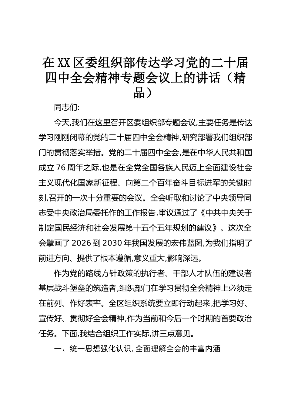 在XX區(qū)委組織部傳達(dá)學(xué)習(xí)黨的二十屆四中全會(huì)精神專題會(huì)議上的講話(精品)同志們:今天,我們在這里召開區(qū)委組織部專題會(huì)議,主要任務(wù)是傳達(dá)學(xué)習(xí)剛剛閉幕的黨的二十屆四中全會(huì)精神,研究部署我們組織部門的貫徹落實(shí)舉措。黨的二十屆四中全會(huì),是在中華人民共和國成立76周年之際,也是在全黨全國各族人民邁上全面建設(shè)社會(huì)主義現(xiàn)代化國家新征程、向第二個(gè)百年奮斗目標(biāo)進(jìn)軍的關(guān)鍵時(shí)刻,召開的一次十分重要的會(huì)議。全會(huì)聽取和討論了中央領(lǐng)導(dǎo)同志受中央政治局委托作的工作報(bào)告,審議通過了《中共中央關(guān)于制定國民經(jīng)濟(jì)和社會(huì)發(fā)展第十五個(gè)五年規(guī)劃的建議》。這次全會(huì)擘畫了2026到2030年我...
