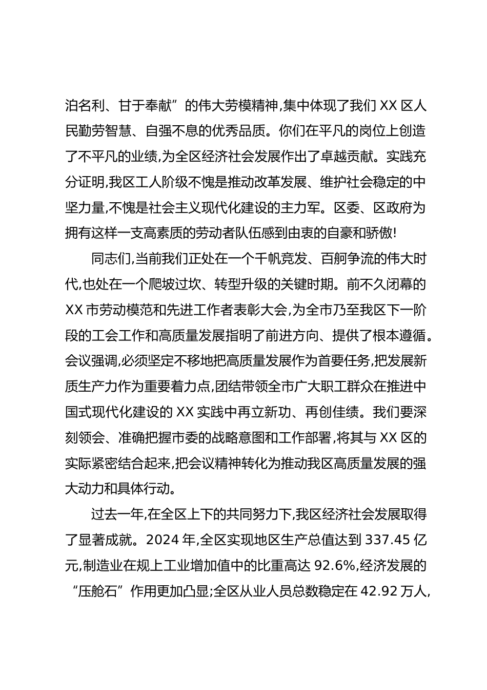 在XX區(qū)總工會(huì)專題會(huì)議暨勞模座談會(huì)上的講話(精品)各位勞動(dòng)模范、先進(jìn)工作者,同志們、朋友們:大家上午好!今天,我們在這里隆重集會(huì),召開區(qū)總工會(huì)專題會(huì)議暨勞模座談會(huì),主要任務(wù)是深入學(xué)習(xí)傳達(dá)XX市勞動(dòng)模范和先進(jìn)工作者表彰大會(huì)暨工會(huì)工作高質(zhì)量發(fā)展會(huì)議精神,并與我區(qū)新當(dāng)選的市級勞模和先進(jìn)工作者代表們進(jìn)行座談交流,共同感悟奮斗初心,凝聚奮進(jìn)力量。剛才,XX同志傳達(dá)了市委、市政府的重要會(huì)議精神,幾位勞模代表結(jié)合自身經(jīng)歷作了非常感人、非常深刻的發(fā)言,工會(huì)的同志也談了下一步的工作思路,聽了以后很受教育、很受啟發(fā)。首先,我代表區(qū)委、區(qū)政府,向剛剛受到XX市表彰的12...