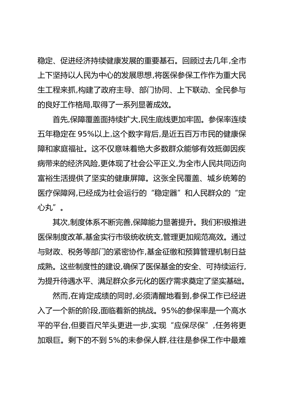 在XX市2026年度基本醫(yī)療保險(xiǎn)參保全覆蓋工作會(huì)議上的講話(huà)(精品)同志們:今天,市委、市政府在這里召開(kāi)全市2026年度基本醫(yī)療保險(xiǎn)參保全覆蓋工作會(huì)議,主要任務(wù)是總結(jié)過(guò)去一年的工作成效,分析當(dāng)前面臨的新形勢(shì)新挑戰(zhàn),全面部署下一階段的參保征繳工作。剛才,XX同志通報(bào)了2025年度全市的參保工作情況,成績(jī)值得肯定。截至今年9月底,全市基本醫(yī)療保險(xiǎn)參保人數(shù)達(dá)到474.24萬(wàn)人,常住人口參保率穩(wěn)定在95.08%,這是連續(xù)第五年將這一關(guān)鍵指標(biāo)穩(wěn)定在95%以上,標(biāo)志著“十四五”規(guī)劃確定的全民醫(yī)療保障目標(biāo)在我市得到了圓滿(mǎn)實(shí)現(xiàn)。這個(gè)成績(jī)的取得,離不開(kāi)在座各位以及全市各級(jí)各部門(mén)同志們的辛...