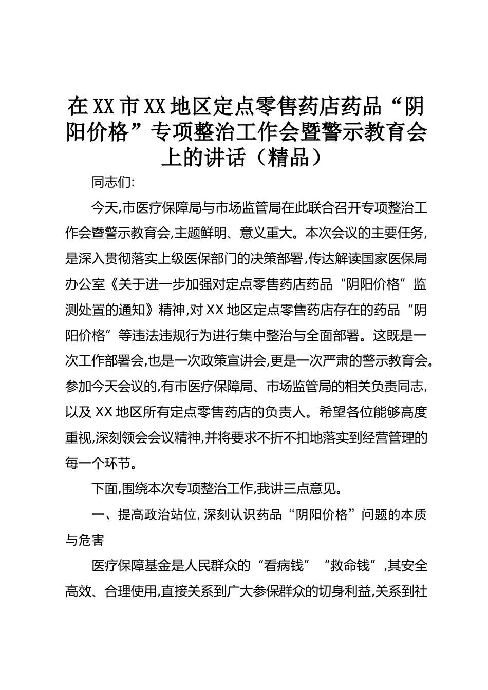 在XX市XX地區(qū)定點零售藥店藥品“陰陽價格”專項整治工作會暨警示教育會上的講話(精品)