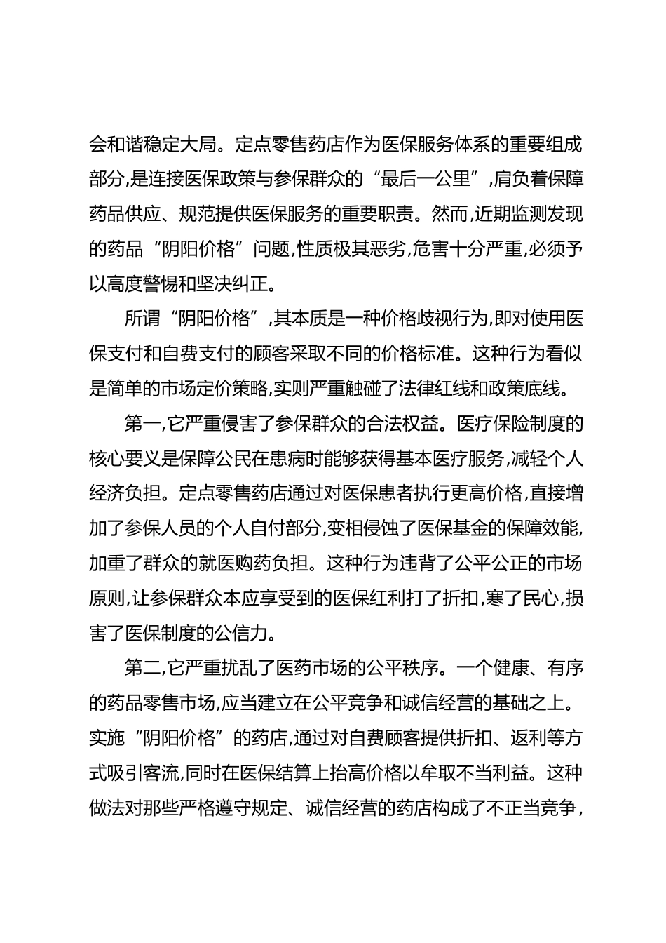 在XX市XX地區(qū)定點零售藥店藥品“陰陽價格”專項整治工作會暨警示教育會上的講話(精品)同志們:今天,市醫(yī)療保障局與市場監(jiān)管局在此聯(lián)合召開專項整治工作會暨警示教育會,主題鮮明、意義重大。本次會議的主要任務,是深入貫徹落實上級醫(yī)保部門的決策部署,傳達解讀國家醫(yī)保局辦公室《關于進一步加強對定點零售藥店藥品“陰陽價格”監(jiān)測處置的通知》精神,對XX地區(qū)定點零售藥店存在的藥品“陰陽價格”等違法違規(guī)行為進行集中整治與全面部署。這既是一次工作部署會,也是一次政策宣講會,更是一次嚴肅的警示教育會。參加今天會議的,有市醫(yī)療保障局、市場監(jiān)管局的相關負責同志,以及...