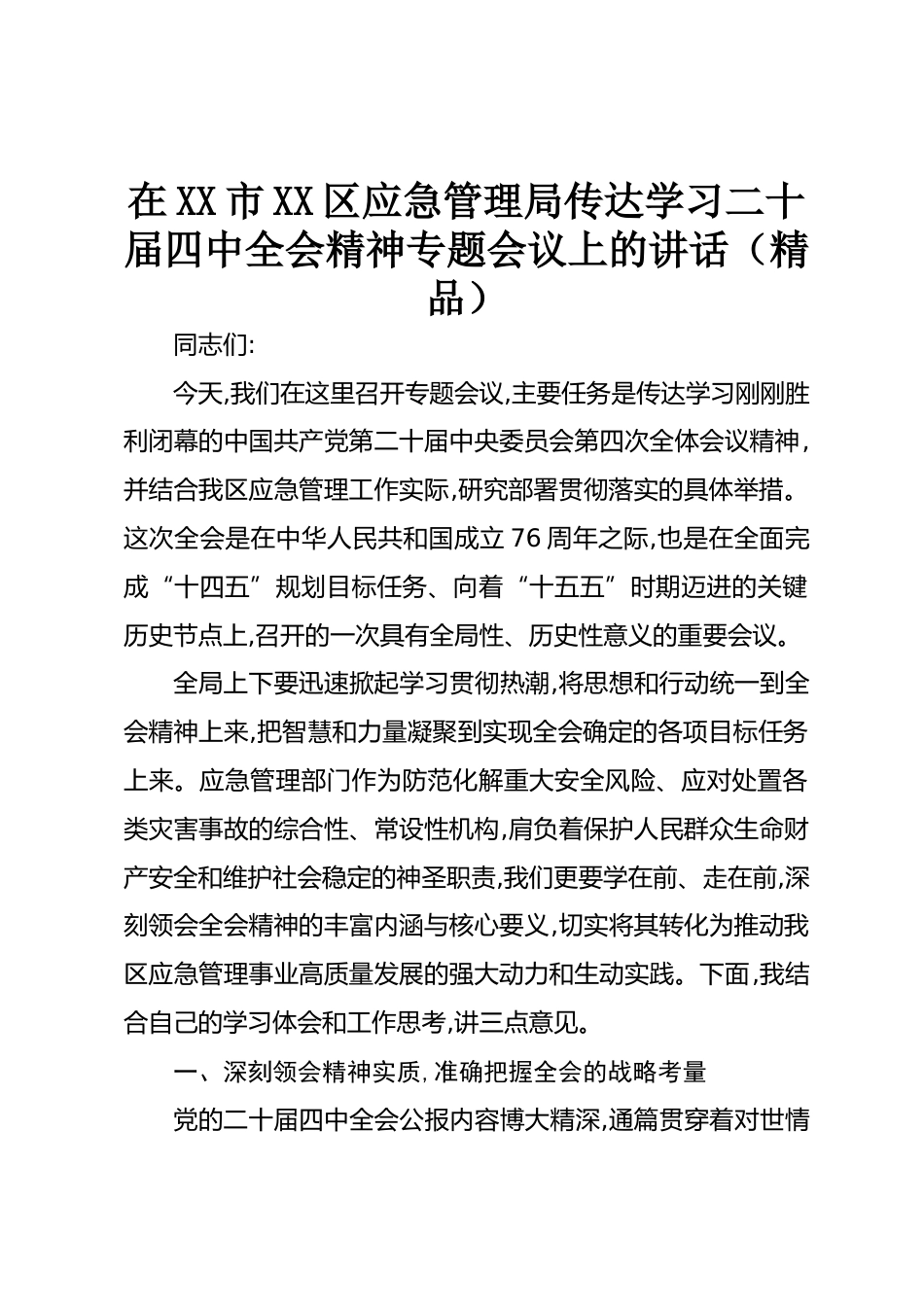 在XX市XX區(qū)應(yīng)急管理局傳達(dá)學(xué)習(xí)二十屆四中全會(huì)精神專題會(huì)議上的講話(精品)VIP免費(fèi)優(yōu)質(zhì)