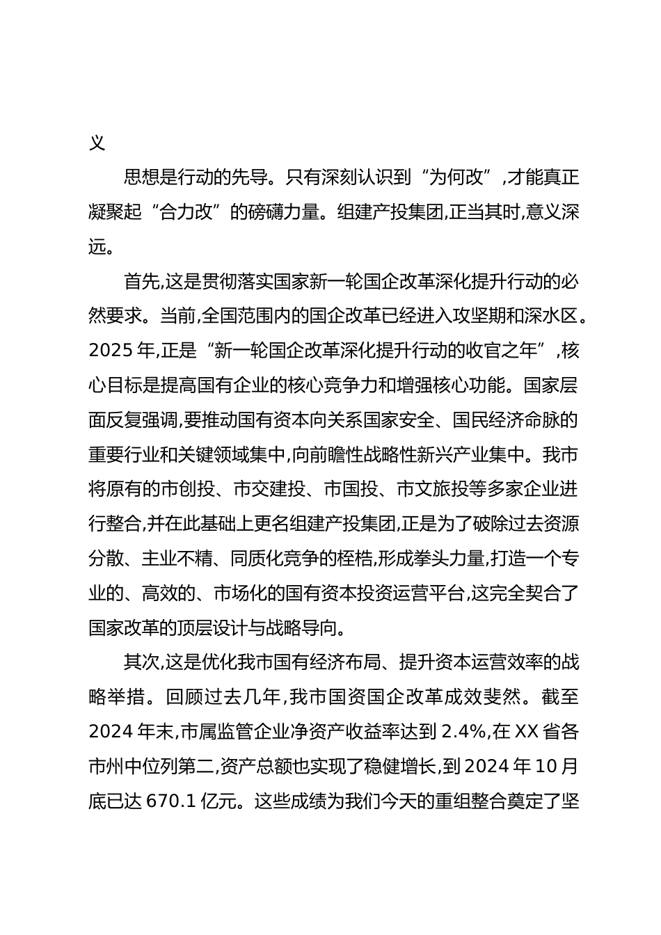 在XX市產(chǎn)業(yè)投資集團(tuán)組建工作動(dòng)員大會(huì)上的講話(精品)同志們:今天,我們?cè)谶@里隆重集會(huì),召開XX市產(chǎn)業(yè)投資集團(tuán)組建工作動(dòng)員大會(huì)。這次會(huì)議的主要任務(wù)是,深入貫徹落實(shí)市委、市政府關(guān)于深化市屬國(guó)有企業(yè)改革的重大決策部署,全面啟動(dòng)XX市產(chǎn)業(yè)投資集團(tuán)的組建工作。這標(biāo)志著我市國(guó)資國(guó)企改革邁出了新的關(guān)鍵一步,也標(biāo)志著原XX集團(tuán)的發(fā)展翻開了嶄新的歷史篇章。在此,我代表集團(tuán)籌備組,向長(zhǎng)期以來關(guān)心支持我市國(guó)企改革發(fā)展的市委、市政府、市國(guó)資委領(lǐng)導(dǎo),以及為集團(tuán)發(fā)展付出辛勤努力的全體干部職工,表示衷心的感謝!組建產(chǎn)投集團(tuán),是市委、市政府立足全市發(fā)展大局、優(yōu)化國(guó)有資本布局、...