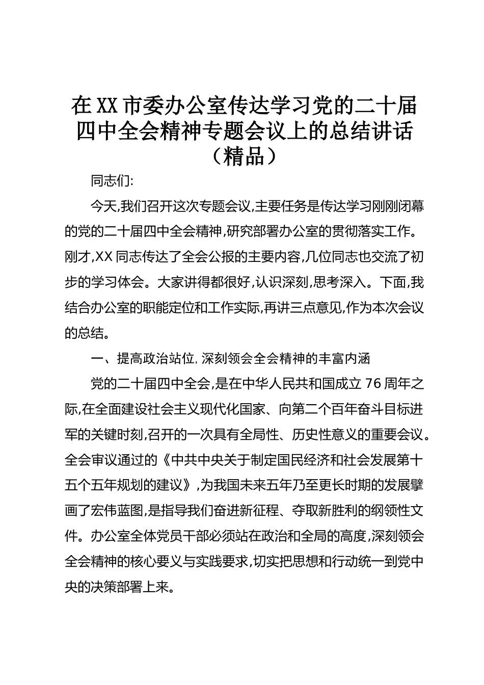 在XX市委辦公室傳達學習黨的二十屆四中全會精神專題會議上的總結(jié)講話(精品)