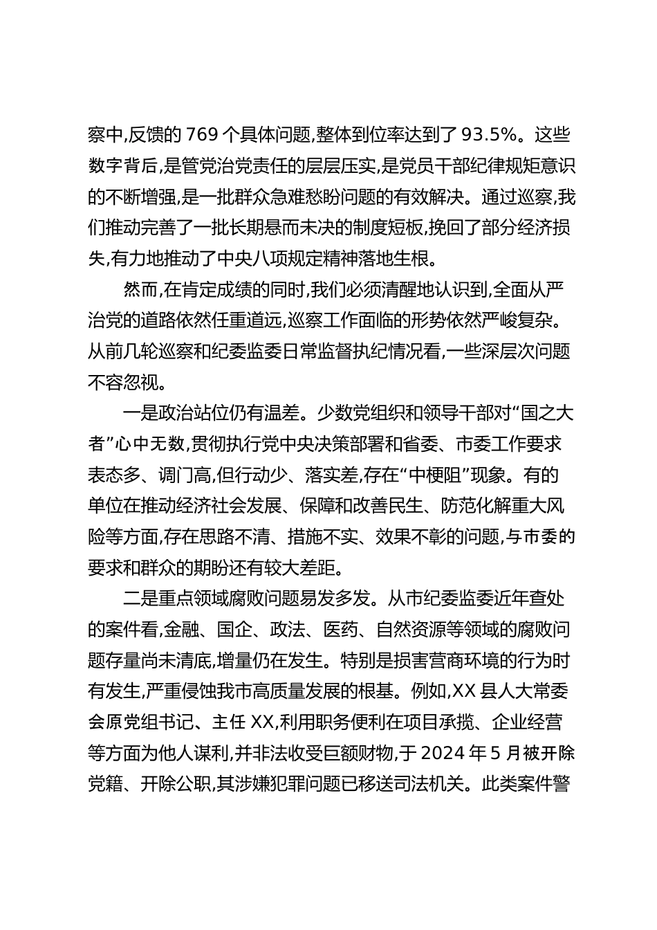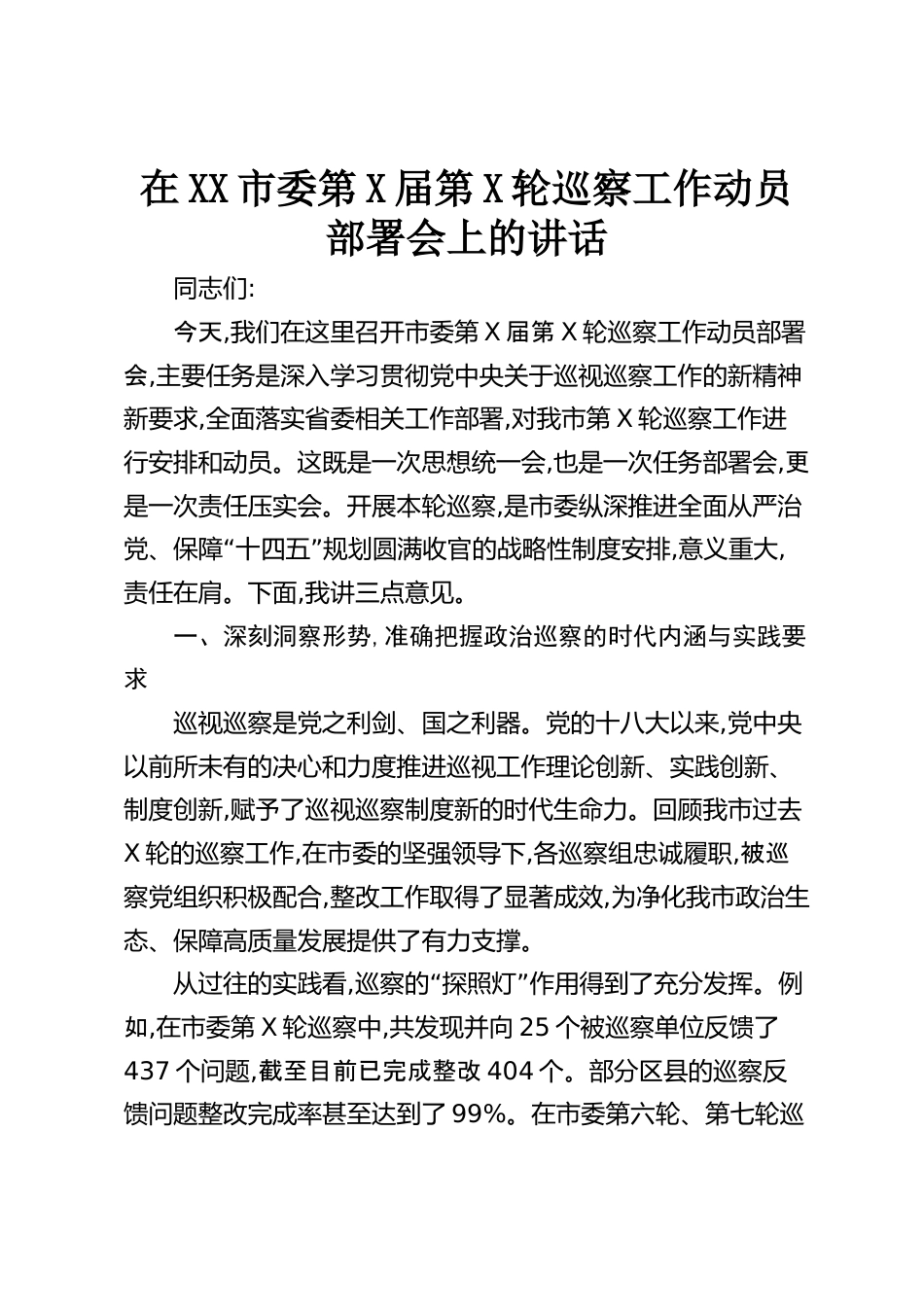 在XX市委第X屆第X輪巡察工作動(dòng)員部署會(huì)上的講話同志們:今天,我們在這里召開市委第X屆第X輪巡察工作動(dòng)員部署會(huì),主要任務(wù)是深入學(xué)習(xí)貫徹黨中央關(guān)于巡視巡察工作的新精神新要求,全面落實(shí)省委相關(guān)工作部署,對我市第X輪巡察工作進(jìn)行安排和動(dòng)員。這既是一次思想統(tǒng)一會(huì),也是一次任務(wù)部署會(huì),更是一次責(zé)任壓實(shí)會(huì)。開展本輪巡察,是市委縱深推進(jìn)全面從嚴(yán)治“”黨、保障十四五規(guī)劃圓滿收官的戰(zhàn)略性制度安排,意義重大,責(zé)任在肩。下面,我講三點(diǎn)意見。一、深刻洞察形勢,準(zhǔn)確把握政治巡察的時(shí)代內(nèi)涵與實(shí)踐要求巡視巡察是黨之利劍、國之利器。黨的十八大以來,黨中央以前所未有的決心和力度...