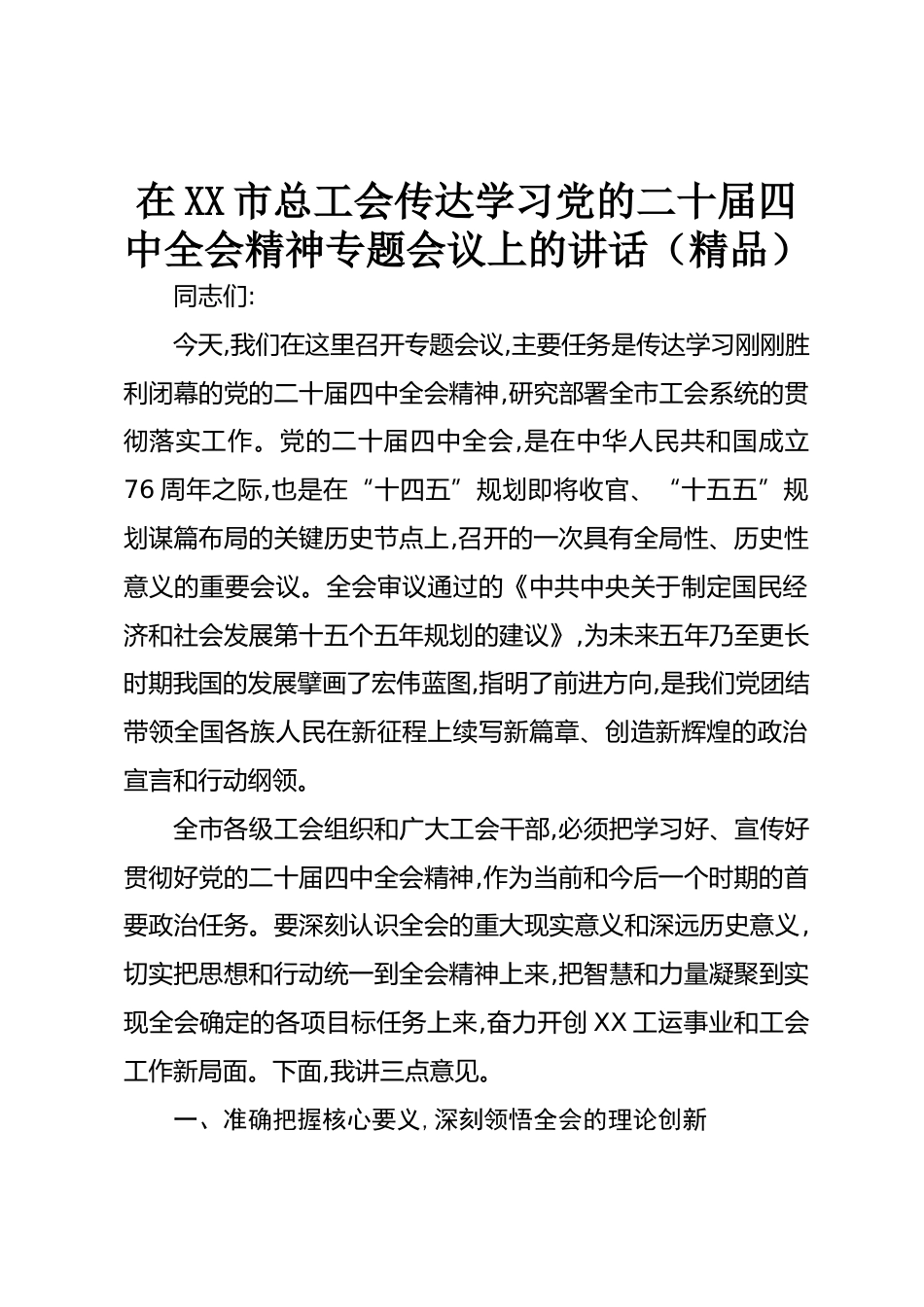 在XX市總工會傳達(dá)學(xué)習(xí)黨的二十屆四中全會精神專題會議上的講話(精品)同志們:今天,我們在這里召開專題會議,主要任務(wù)是傳達(dá)學(xué)習(xí)剛剛勝利閉幕的黨的二十屆四中全會精神,研究部署全市工會系統(tǒng)的貫徹落實(shí)工作。黨的二十屆四中全會,是在中華人民共和國成立76周年之際,也是在“十四五”規(guī)劃即將收官、“十五五”規(guī)劃謀篇布局的關(guān)鍵歷史節(jié)點(diǎn)上,召開的一次具有全局性、歷史性意義的重要會議。全會審議通過的《中共中央關(guān)于制定國民經(jīng)濟(jì)和社會發(fā)展第十五個五年規(guī)劃的建議》,為未來五年乃至更長時期我國的發(fā)展擘畫了宏偉藍(lán)圖,指明了前進(jìn)方向,是我們黨團(tuán)結(jié)帶領(lǐng)全國各族人民在新征程...