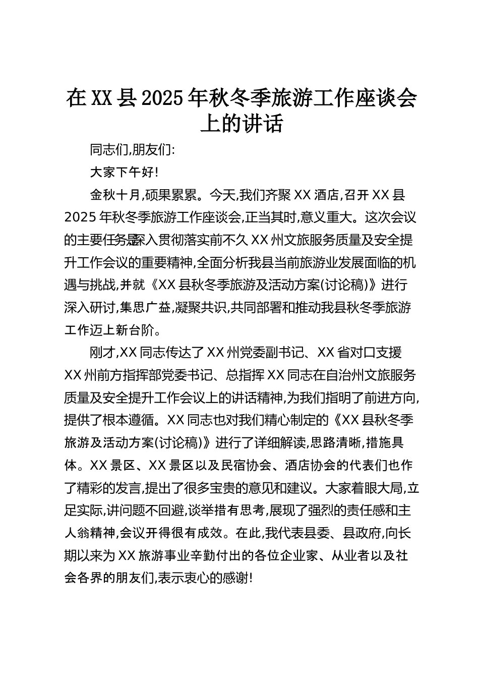 在XX縣2025年秋冬季旅游工作座談會上的講話VIP免費
