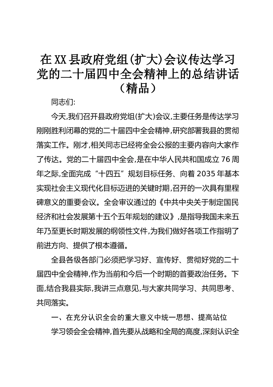 在XX縣政府黨組(擴大)會議傳達學(xué)習(xí)黨的二十屆四中全會精神上的總結(jié)講話(精品)優(yōu)質(zhì)