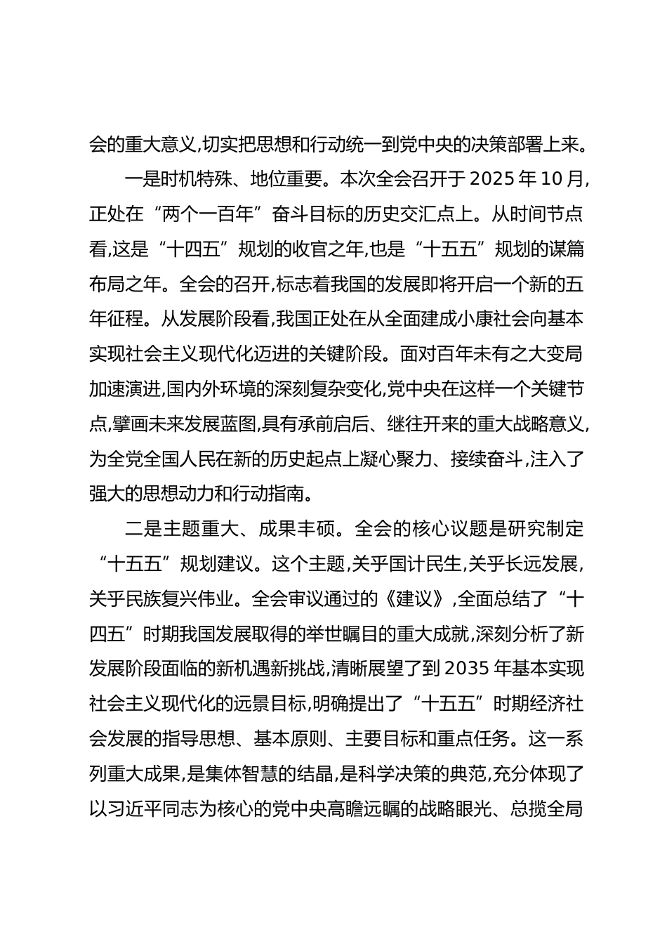 在XX縣政府黨組(擴大)會議傳達學(xué)習(xí)黨的二十屆四中全會精神上的總結(jié)講話(精品)同志們:今天,我們召開縣政府黨組(擴大)會議,主要任務(wù)是傳達學(xué)習(xí)剛剛勝利閉幕的黨的二十屆四中全會精神,研究部署我縣的貫徹落實工作。剛才,相關(guān)同志已經(jīng)將全會公報的主要內(nèi)容向大家作了傳達。黨的二十屆四中全會,是在中華人民共和國成立76周年之際,全面完成“十四五”規(guī)劃目標(biāo)任務(wù)、向著2035年基本實現(xiàn)社會主義現(xiàn)代化目標(biāo)邁進的關(guān)鍵時期,召開的一次具有里程碑意義的重要會議。全會審議通過的《中共中央關(guān)于制定國民經(jīng)濟和社會發(fā)展第十五個五年規(guī)劃的建議》,是指導(dǎo)我國未來五年乃至更長時期發(fā)...