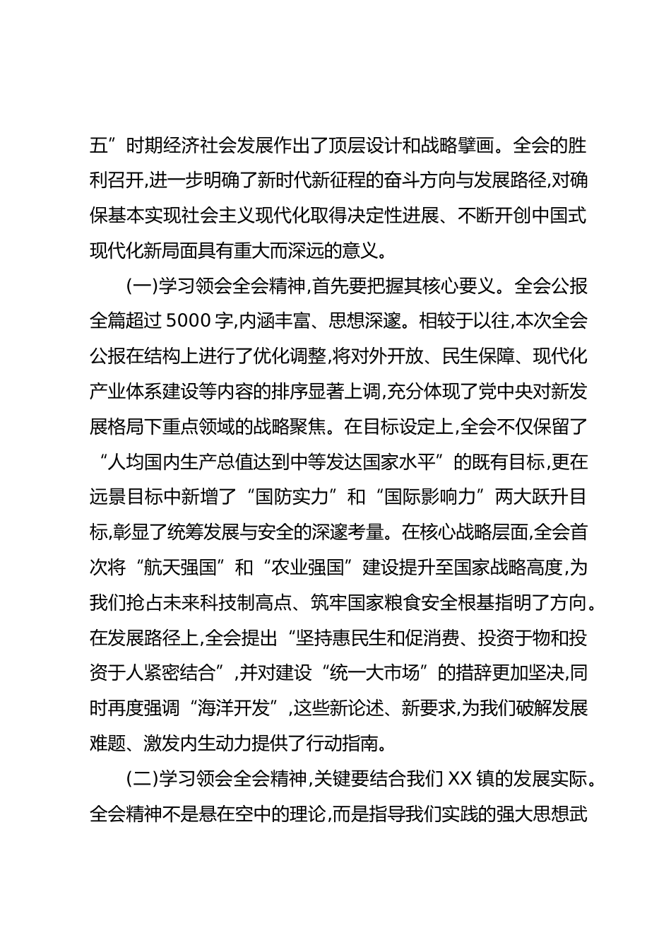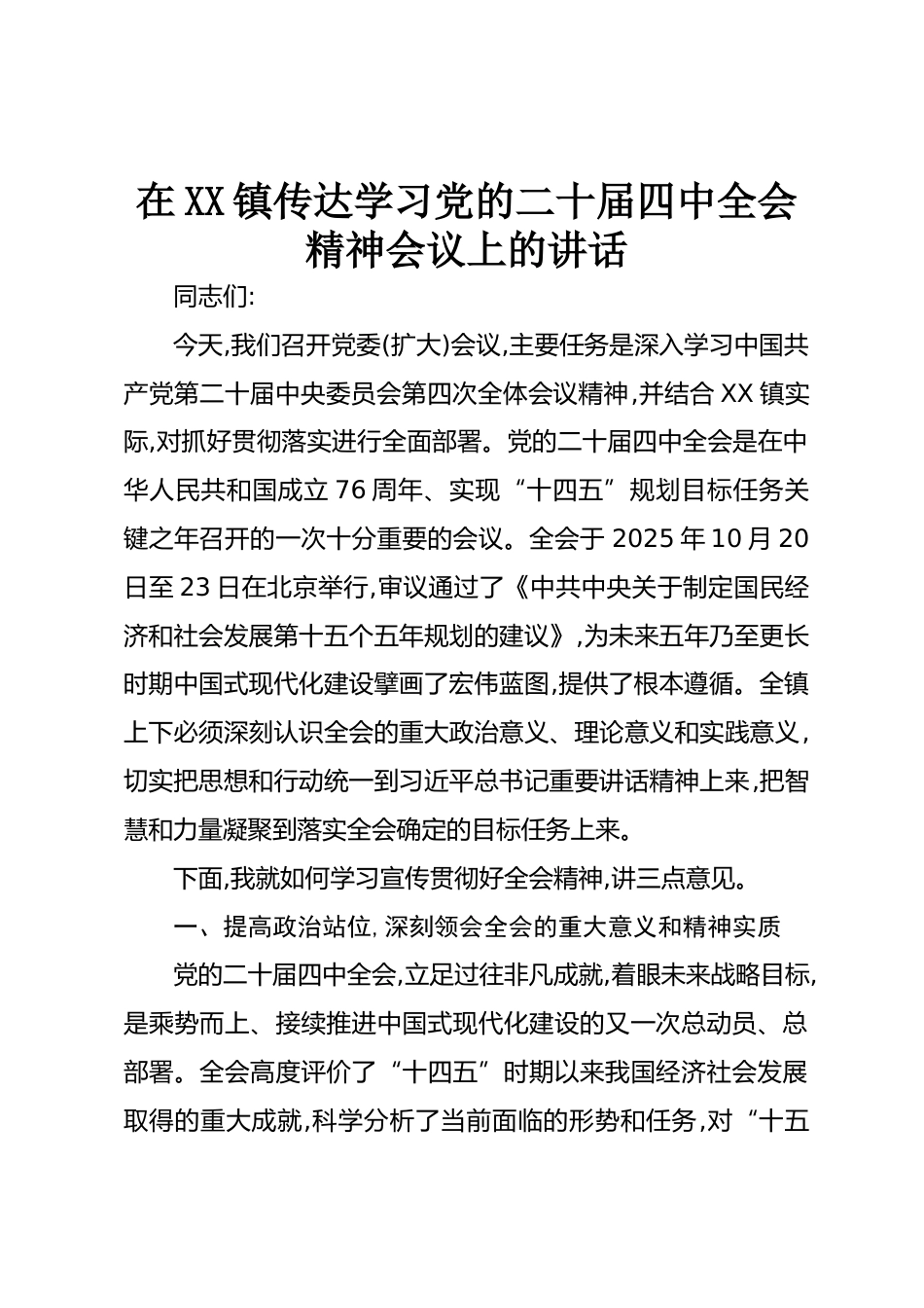 在XX鎮(zhèn)傳達(dá)學(xué)習(xí)黨的二十屆四中全會(huì)精神會(huì)議上的講話同志們:今天,我們召開黨委(擴(kuò)大)會(huì)議,主要任務(wù)是深入學(xué)習(xí)中國共產(chǎn)黨第二十屆中央委員會(huì)第四次全體會(huì)議精神,并結(jié)合XX鎮(zhèn)實(shí)際,對抓好貫徹落實(shí)進(jìn)行全面部署。黨的二十屆四中全會(huì)是在中華人民共和國成立76周年、實(shí)現(xiàn)“十四五”規(guī)劃目標(biāo)任務(wù)關(guān)鍵之年召開的一次十分重要的會(huì)議。全會(huì)于2025年10月20日至23日在北京舉行,審議通過了《中共中央關(guān)于制定國民經(jīng)濟(jì)和社會(huì)發(fā)展第十五個(gè)五年規(guī)劃的建議》,為未來五年乃至更長時(shí)期中國式現(xiàn)代化建設(shè)擘畫了宏偉藍(lán)圖,提供了根本遵循。全鎮(zhèn)上下必須深刻認(rèn)識(shí)全會(huì)的重大政治意義、理論意義和實(shí)踐...