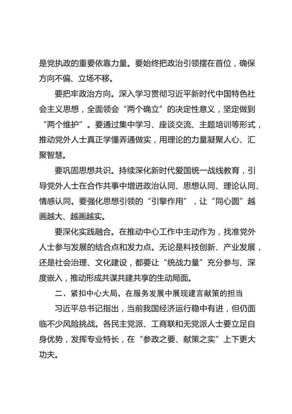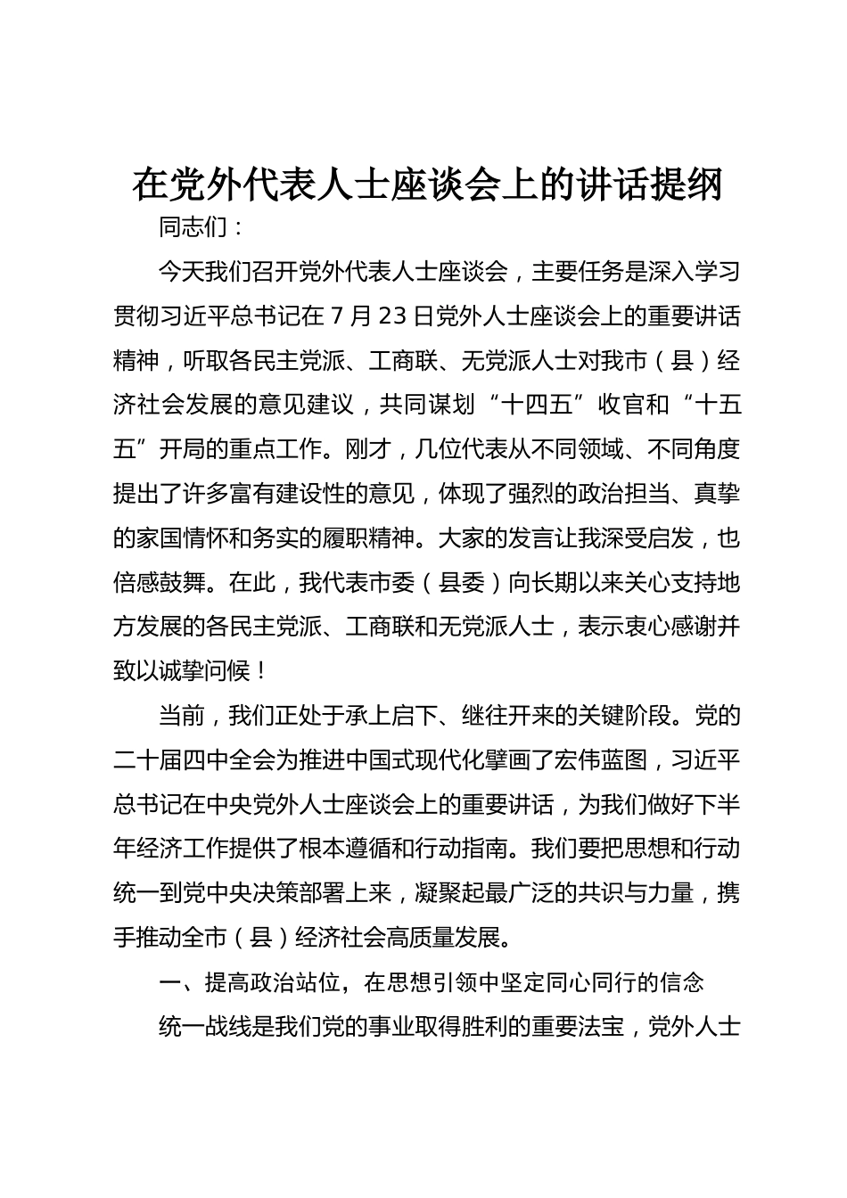 在黨外代表人士座談會上的講話提綱同志們:今天我們召開黨外代表人士座談會,主要任務是深入學習貫徹習近平總書記在7月23日黨外人士座談會上的重要講話精神,聽取各民主黨派、工商聯(lián)、無黨派人士對我市(縣)經(jīng)濟社會發(fā)展的意見建議,共同謀劃“十四五”收官和“十五五”開局的重點工作。剛才,幾位代表從不同領域、不同角度提出了許多富有建設性的意見,體現(xiàn)了強烈的政治擔當、真摯的家國情懷和務實的履職精神。大家的發(fā)言讓我深受啟發(fā),也倍感鼓舞。在此,我代表市委(縣委)向長期以來關心支持地方發(fā)展的各民主黨派、工商聯(lián)和無黨派人士,表示衷心感謝并致以誠摯問候...