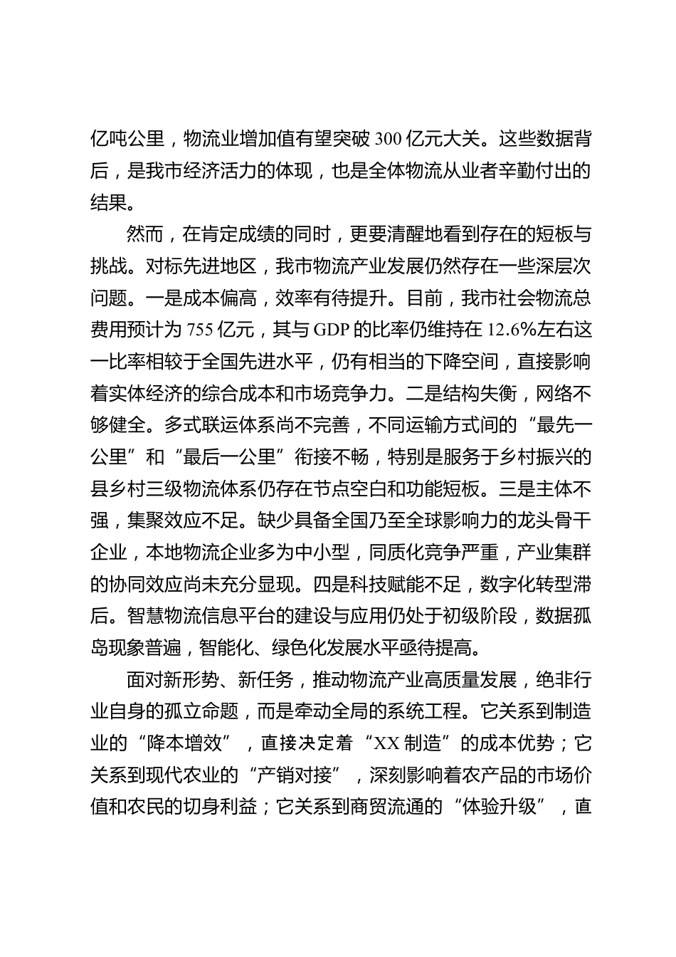 在XX市物流產(chǎn)業(yè)發(fā)展座談會(huì)上的講話同志們,企業(yè)家朋友們:今天,我們?cè)诖苏匍_(kāi)全市物流產(chǎn)業(yè)發(fā)展座談會(huì),主要目的是分析當(dāng)前形勢(shì),統(tǒng)一思想認(rèn)識(shí),研究部署下一階段推動(dòng)全市物流產(chǎn)業(yè)高質(zhì)量發(fā)展的重點(diǎn)任務(wù)。剛才,市直有關(guān)單位匯報(bào)了全市物流產(chǎn)業(yè)發(fā)展的總體情況,幾位企業(yè)家代表結(jié)合自身實(shí)踐,提出了許多富有建設(shè)性的意見(jiàn)和建議,聽(tīng)后很受啟發(fā)。物流是實(shí)體經(jīng)濟(jì)的“筋絡(luò)”,是連接生產(chǎn)和消費(fèi)、內(nèi)貿(mào)和外貿(mào)的“動(dòng)脈”,更是衡量一個(gè)地區(qū)綜合競(jìng)爭(zhēng)力的重要標(biāo)志。推動(dòng)物流產(chǎn)業(yè)發(fā)展,是促進(jìn)我市經(jīng)濟(jì)社會(huì)高質(zhì)量發(fā)展的關(guān)鍵舉措。當(dāng)前,我市正處在產(chǎn)業(yè)轉(zhuǎn)型升級(jí)、新舊動(dòng)能轉(zhuǎn)換的關(guān)鍵時(shí)期...