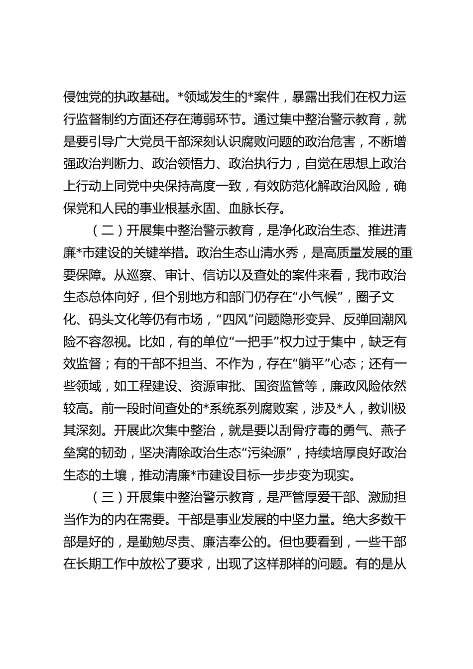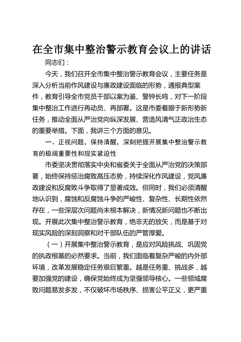 在全市集中整治警示教育會(huì)議上的講話同志們:今天,我們召開全市集中整治警示教育會(huì)議,主要任務(wù)是深入分析當(dāng)前作風(fēng)建設(shè)與廉政建設(shè)面臨的形勢(shì),通報(bào)典型案件,教育引導(dǎo)全市黨員干部以案為鑒、警鐘長(zhǎng)鳴,對(duì)下一階段集中整治工作進(jìn)行再動(dòng)員、再部署。這是市委著眼于新形勢(shì)新任務(wù),推動(dòng)全面從嚴(yán)治黨向縱深發(fā)展、營(yíng)造風(fēng)清氣正政治生態(tài)的重要舉措。下面,我講三個(gè)方面的意見。一、正視問(wèn)題,保持清醒,深刻把握開展集中整治警示教育的極端重要性和現(xiàn)實(shí)緊迫性市委堅(jiān)決貫徹落實(shí)中央和省委關(guān)于全面從嚴(yán)治黨的決策部署,始終保持懲治腐敗高壓態(tài)勢(shì),持續(xù)深化作風(fēng)建設(shè),黨風(fēng)廉政建設(shè)...