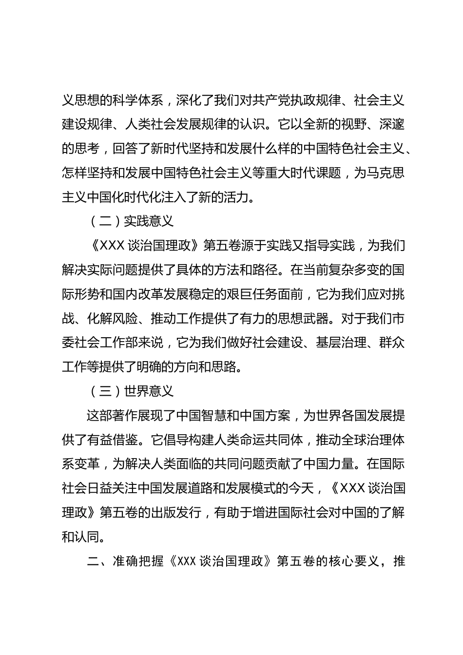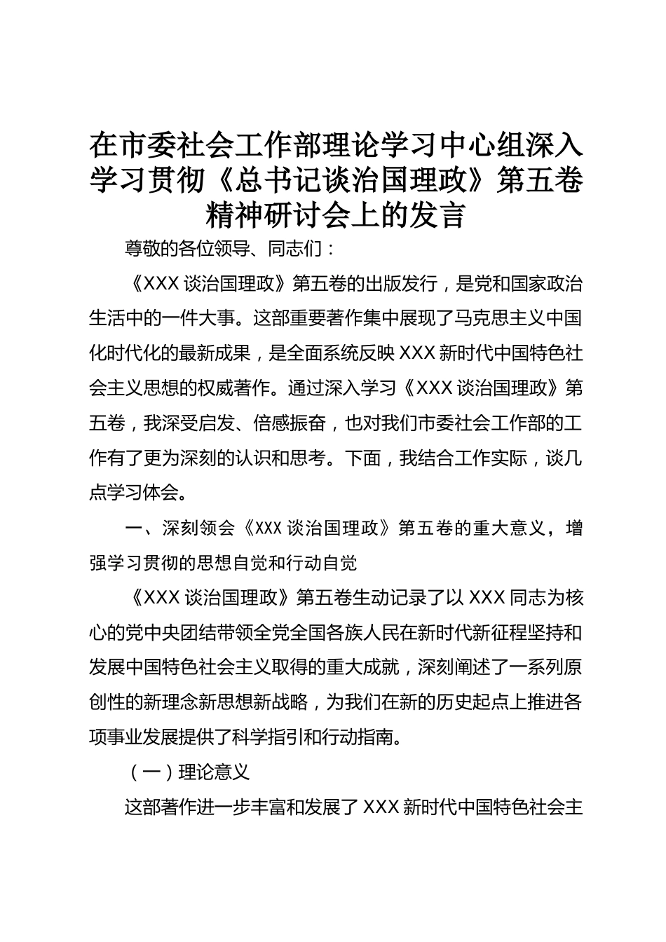 在市委社會(huì)工作部理論學(xué)習(xí)中心組深入學(xué)習(xí)貫徹《總書(shū)記談治國(guó)理政》第五卷精神研討會(huì)上的發(fā)言尊敬的各位領(lǐng)導(dǎo)、同志們:《XXX談治國(guó)理政》第五卷的出版發(fā)行,是黨和國(guó)家政治生活中的一件大事。這部重要著作集中展現(xiàn)了馬克思主義中國(guó)化時(shí)代化的最新成果,是全面系統(tǒng)反映XXX新時(shí)代中國(guó)特色社會(huì)主義思想的權(quán)威著作。通過(guò)深入學(xué)習(xí)《XXX談治國(guó)理政》第五卷,我深受啟發(fā)、倍感振奮,也對(duì)我們市委社會(huì)工作部的工作有了更為深刻的認(rèn)識(shí)和思考。下面,我結(jié)合工作實(shí)際,談幾點(diǎn)學(xué)習(xí)體會(huì)。一、深刻領(lǐng)會(huì)《XXX談治國(guó)理政》第五卷的重大意義,增強(qiáng)學(xué)習(xí)貫徹的思想自覺(jué)和行動(dòng)自覺(jué)《XXX談治國(guó)...