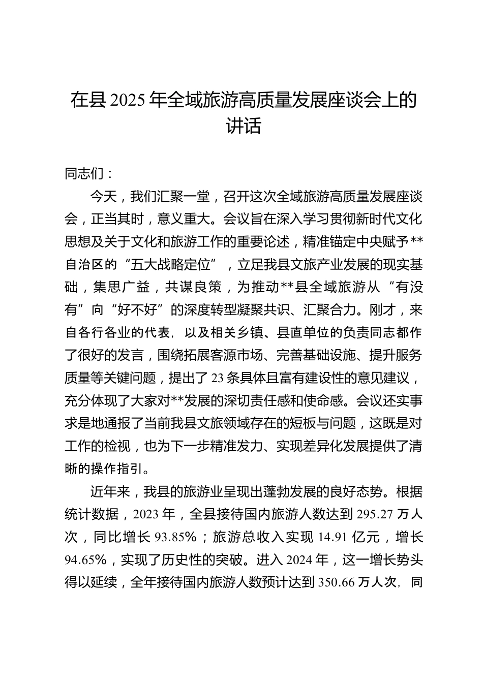 在縣2025年全域旅游高質(zhì)量發(fā)展座談會(huì)上的講話VIP免費(fèi)