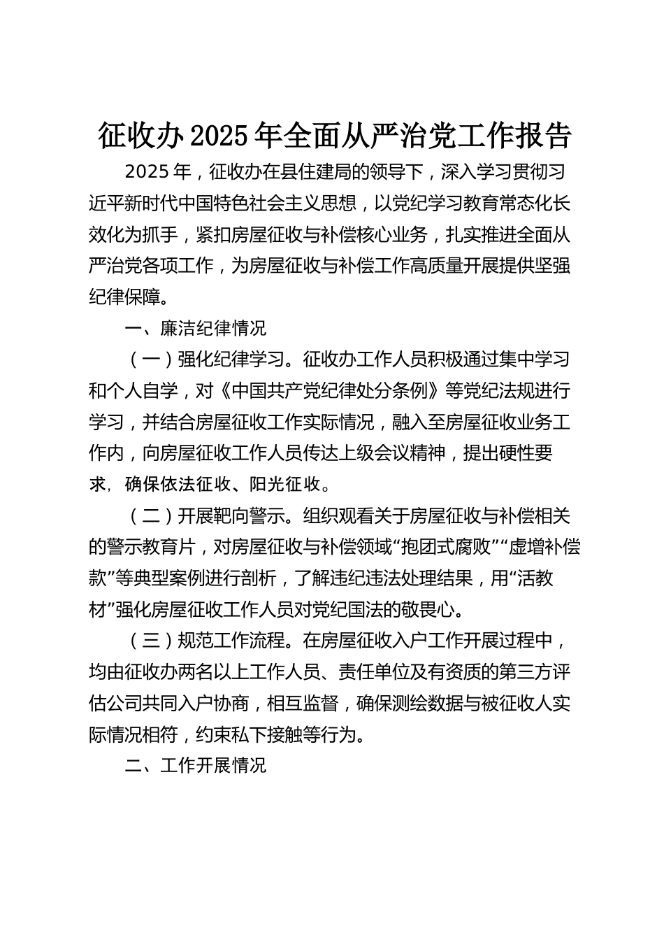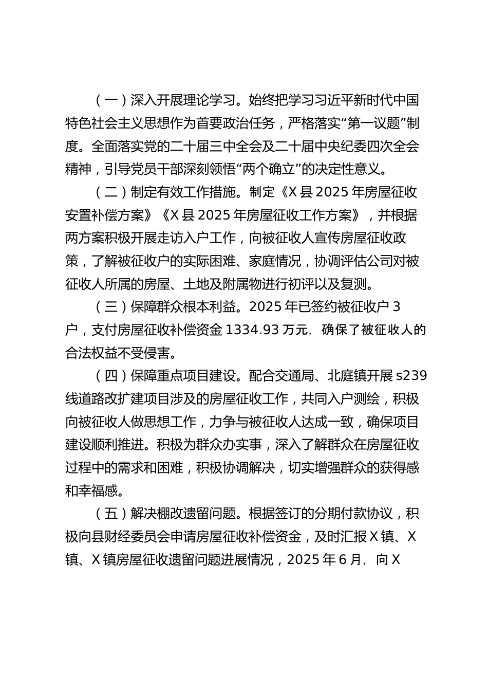 征收辦2025年全面從嚴治黨工作報告2025年,征收辦在縣住建局的領導下,深入學習貫徹習近平新時代中國特色社會主義思想,以黨紀學習教育常態(tài)化長效化為抓手,緊扣房屋征收與補償核心業(yè)務,扎實推進全面從嚴治黨各項工作,為房屋征收與補償工作高質量開展提供堅強紀律保障。一、廉潔紀律情況(一)強化紀律學習。征收辦工作人員積極通過集中學習和個人自學,對《中國共產(chǎn)黨紀律處分條例》等黨紀法規(guī)進行學習,并結合房屋征收工作實際情況,融入至房屋征收業(yè)務工作內,向房屋征收工作人員傳達上級會議精神,提出硬性要求,確保依法征收、陽光征收。(二)開展靶向警示。組織...