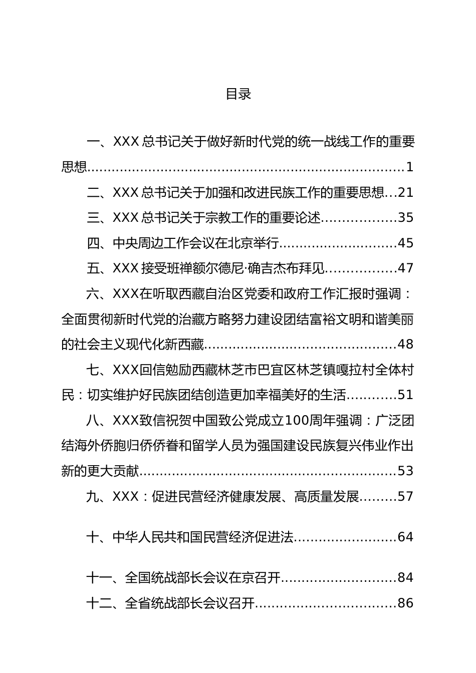 目錄一、XXX總書(shū)記關(guān)于做好新時(shí)代黨的統(tǒng)一戰(zhàn)線工作的重要思想..............................................................................1二、XXX總書(shū)記關(guān)于加強(qiáng)和改進(jìn)民族工作的重要思想...21三、XXX總書(shū)記關(guān)于宗教工作的重要論述..................35四、中央周邊工作會(huì)議在北京舉行.............................45五、XXX接受班禪額爾德尼·確吉杰布拜見(jiàn).................47六、XXX在聽(tīng)取西藏自治區(qū)黨委和政府工作匯報(bào)時(shí)強(qiáng)調(diào):全面貫徹新時(shí)代黨的治藏方略努力建設(shè)團(tuán)結(jié)富裕文明和諧美麗的社會(huì)主義現(xiàn)代化新西藏..................................................