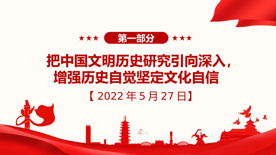 【第八章】治國(guó)理政第五卷全文學(xué)習(xí)發(fā)展新時(shí)代中國(guó)特色社會(huì)主義文化匯報(bào)人:xx匯報(bào)時(shí)間:20XX第一部分把中國(guó)文明歷史研究引向深入,增強(qiáng)歷史自覺(jué)堅(jiān)定文化自信【2022年5月27日】版權(quán)歸屬xi87.cn,官網(wǎng)xi87.cn把中國(guó)文明歷史研究引向深入,增強(qiáng)歷史自覺(jué)堅(jiān)定文化自信今天,中央政治局進(jìn)行第三十九次集體學(xué)習(xí),內(nèi)容是深化中華文明探源工程。安排這次學(xué)習(xí),目的是深入了解中華文明五千多年發(fā)展史,推動(dòng)把中國(guó)文明歷史研究引向深入,推動(dòng)全黨全社會(huì)增強(qiáng)歷史自覺(jué)、堅(jiān)定文化自信,堅(jiān)定不移走中國(guó)特色社會(huì)主義道路,為全面建設(shè)社會(huì)主義現(xiàn)代化國(guó)家、實(shí)現(xiàn)中華民族偉大復(fù)興而團(tuán)結(jié)奮斗...