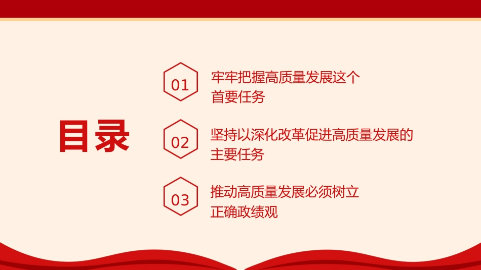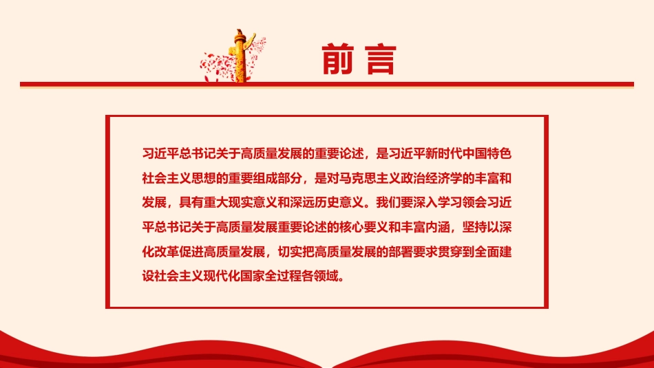 黨課以深化改革促進高質(zhì)量發(fā)展授課人:【公%眾#號:老&船#長%素*材庫】前言來自網(wǎng)站原創(chuàng),侵權(quán)必究習(xí)近平總書記關(guān)于高質(zhì)量發(fā)展的重要論述,是習(xí)近平新時代中國特色社會主義思想的重要組成部分,是對馬克思主義政治經(jīng)濟學(xué)的豐富和發(fā)展,具有重大現(xiàn)實意義和深遠歷史意義。我們要深入學(xué)習(xí)領(lǐng)會習(xí)近平總書記關(guān)于高質(zhì)量發(fā)展重要論述的核心要義和豐富內(nèi)涵,堅持以深化改革促進高質(zhì)量發(fā)展,切實把高質(zhì)量發(fā)展的部署要求貫穿到全面建設(shè)社會主義現(xiàn)代化國家全過程各領(lǐng)域。目錄01牢牢把握高質(zhì)量發(fā)展這個首要任務(wù)02堅持以深化改革促進高質(zhì)量發(fā)展的主要任務(wù)03推動高質(zhì)量發(fā)展必須樹立正確...