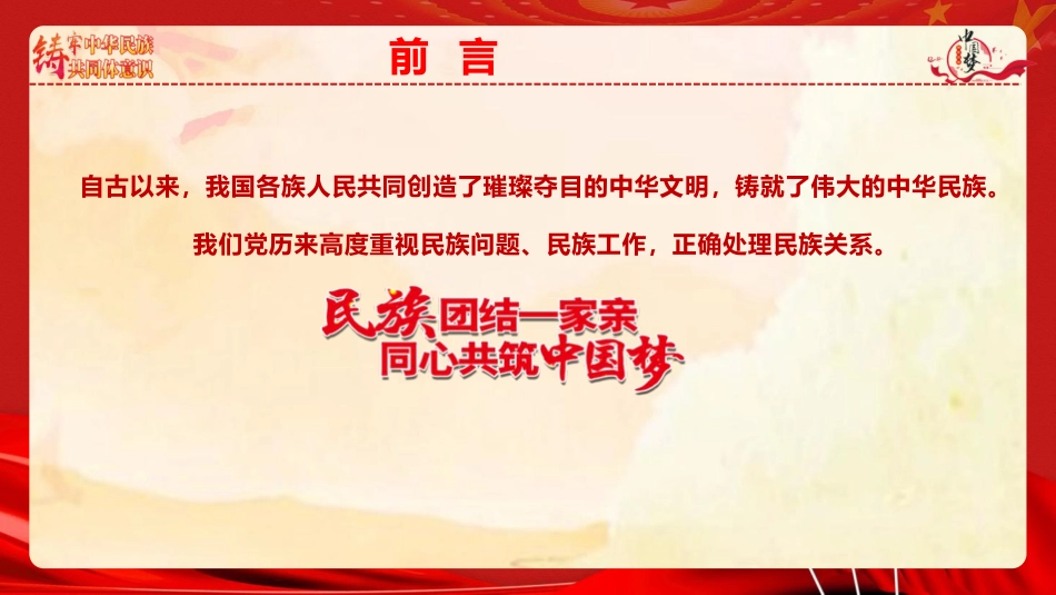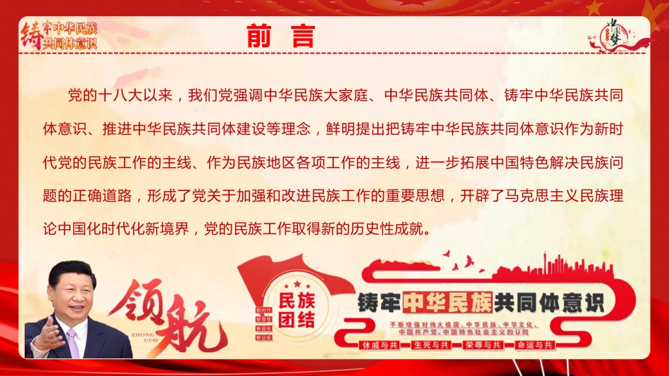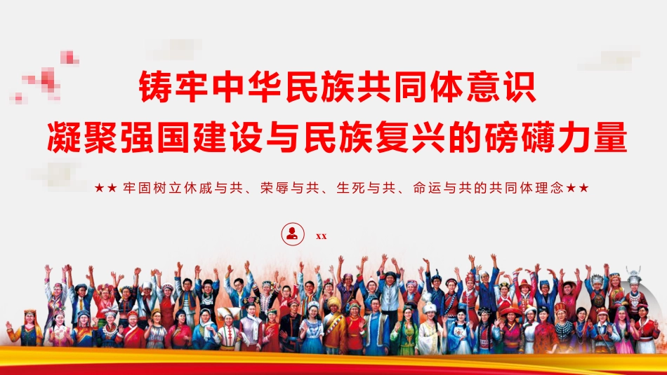 鑄牢中華民族共同體意識(shí)凝聚強(qiáng)國(guó)建設(shè)與民族復(fù)興的磅礴力量xx★★牢固樹(shù)立休戚與共、榮辱與共、生死與共、命運(yùn)與共的共同體理念★★前言自古以來(lái),我國(guó)各族人民共同創(chuàng)造了璀璨奪目的中華文明,鑄就了偉大的中華民族。我們黨歷來(lái)高度重視民族問(wèn)題、民族工作,正確處理民族關(guān)系。前言黨的十八大以來(lái),我們黨強(qiáng)調(diào)中華民族大家庭、中華民族共同體、鑄牢中華民族共同體意識(shí)、推進(jìn)中華民族共同體建設(shè)等理念,鮮明提出把鑄牢中華民族共同體意識(shí)作為新時(shí)代黨的民族工作的主線、作為民族地區(qū)各項(xiàng)工作的主線,進(jìn)一步拓展中國(guó)特色解決民族問(wèn)題的正確道路,形成了黨關(guān)于加強(qiáng)和改進(jìn)民族...