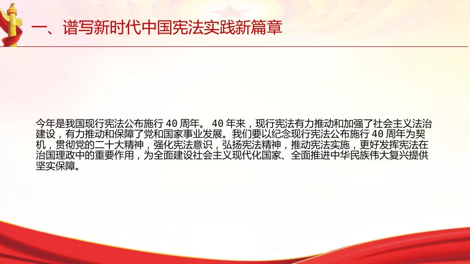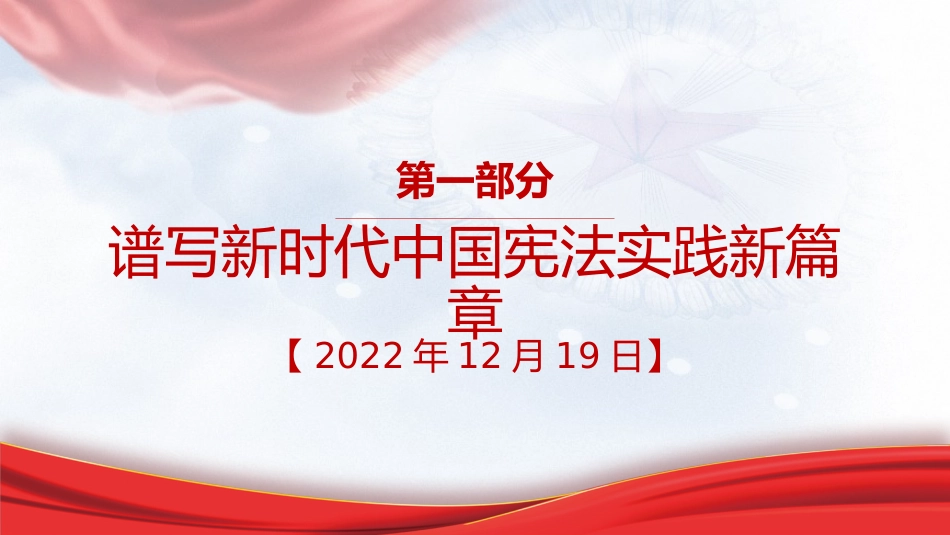 治國理政第五卷全文學(xué)習(xí)授課人:公文派建設(shè)更高水平的法治中國【第七章】版權(quán)歸屬xi87.cn,官網(wǎng)xi87.cn譜寫新時代中國憲法實(shí)踐新篇章第一部分【2022年12月19日】版權(quán)歸屬xi87.cn,官網(wǎng)xi87.cn一、譜寫新時代中國憲法實(shí)踐新篇章今年是我國現(xiàn)行憲法公布施行40周年。40年來,現(xiàn)行憲法有力推動和加強(qiáng)了社會主義法治建設(shè),有力推動和保障了黨和國家事業(yè)發(fā)展。我們要以紀(jì)念現(xiàn)行憲法公布施行40周年為契機(jī),貫徹黨的二十大精神,強(qiáng)化憲法意識,弘揚(yáng)憲法精神,推動憲法實(shí)施,更好發(fā)揮憲法在治國理政中的重要作用,為全面建設(shè)社會主義現(xiàn)代化國家、全面推進(jìn)中華民族偉大復(fù)興提供堅實(shí)...