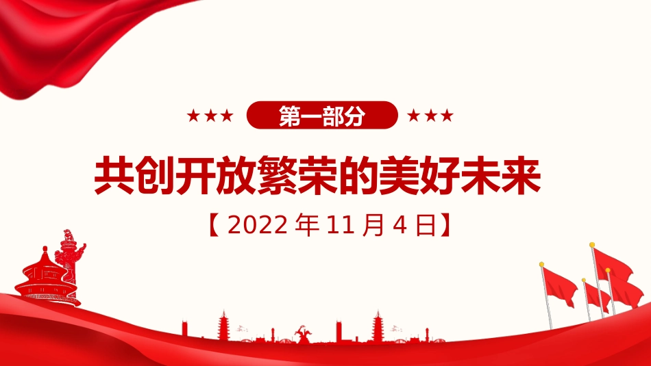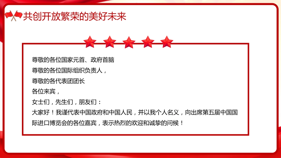 【第三章】治國理政第五卷全文學(xué)習(xí)擴大高水平對外開放匯報人:xx匯報時間:20XX第一部分共創(chuàng)開放繁榮的美好未來【2022年11月4日】版權(quán)歸屬xi87.cn,官網(wǎng)xi87.cn共創(chuàng)開放繁榮的美好未來尊敬的各位國家元首、政府首腦尊敬的各位國際組織負責人,尊敬的各代表團團長各位來賓,女士們,先生們,朋友們:大家好!我謹代表中國政府和中國人民,并以我個人名義,向出席第五屆中國國際進口博覽會的各位嘉賓,表示熱烈的歡迎和誠摯的問候!版權(quán)歸屬xi87.cn,官網(wǎng)xi87.cn共創(chuàng)開放繁榮的美好未來5年前,我宣布舉辦進博會,就是要擴大開放,讓中國大市場成為世界大機遇?,F(xiàn)在,進博會已...