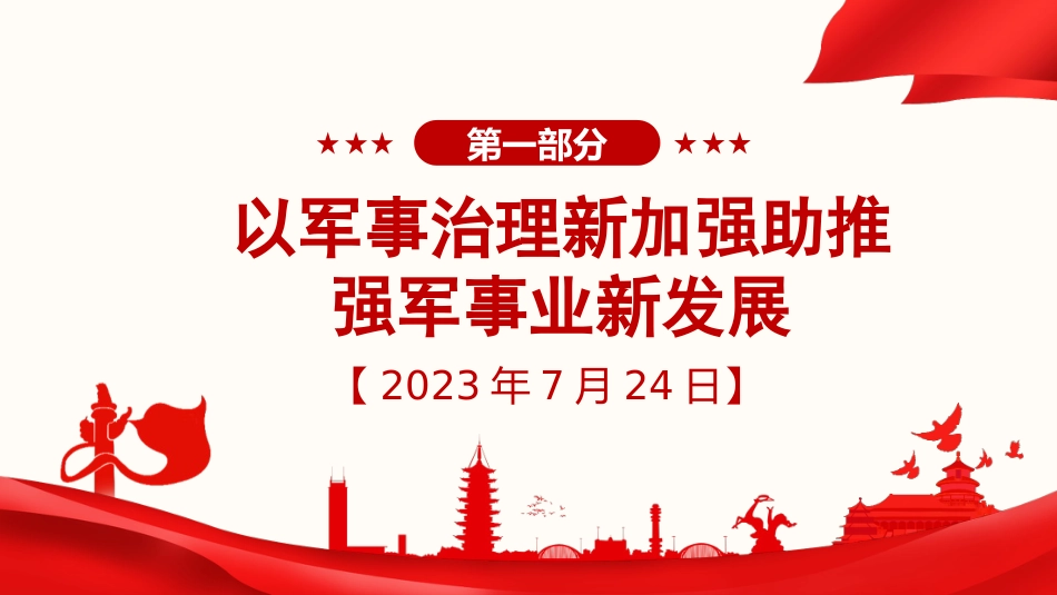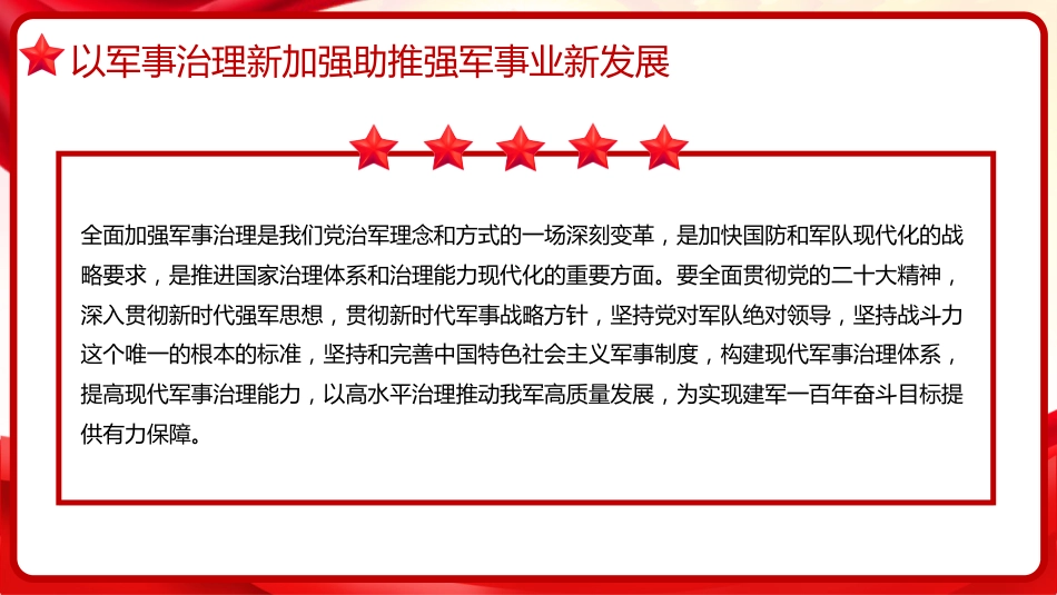 【第十二章】治國理政第五卷全文學(xué)習(xí)全面提高國防和軍隊(duì)現(xiàn)代化水平匯報(bào)人:xx匯報(bào)時(shí)間:20XX第一部分以軍事治理新加強(qiáng)助推強(qiáng)軍事業(yè)新發(fā)展【2023年7月24日】版權(quán)歸屬xi87.cn,官網(wǎng)xi87.cn以軍事治理新加強(qiáng)助推強(qiáng)軍事業(yè)新發(fā)展全面加強(qiáng)軍事治理是我們黨治軍理念和方式的一場深刻變革,是加快國防和軍隊(duì)現(xiàn)代化的戰(zhàn)略要求,是推進(jìn)國家治理體系和治理能力現(xiàn)代化的重要方面。要全面貫徹黨的二十大精神,深入貫徹新時(shí)代強(qiáng)軍思想,貫徹新時(shí)代軍事戰(zhàn)略方針,堅(jiān)持黨對軍隊(duì)絕對領(lǐng)導(dǎo),堅(jiān)持戰(zhàn)斗力這個(gè)唯一的根本的標(biāo)準(zhǔn),堅(jiān)持和完善中國特色社會主義軍事制度,構(gòu)建現(xiàn)代軍事治理體系,提...