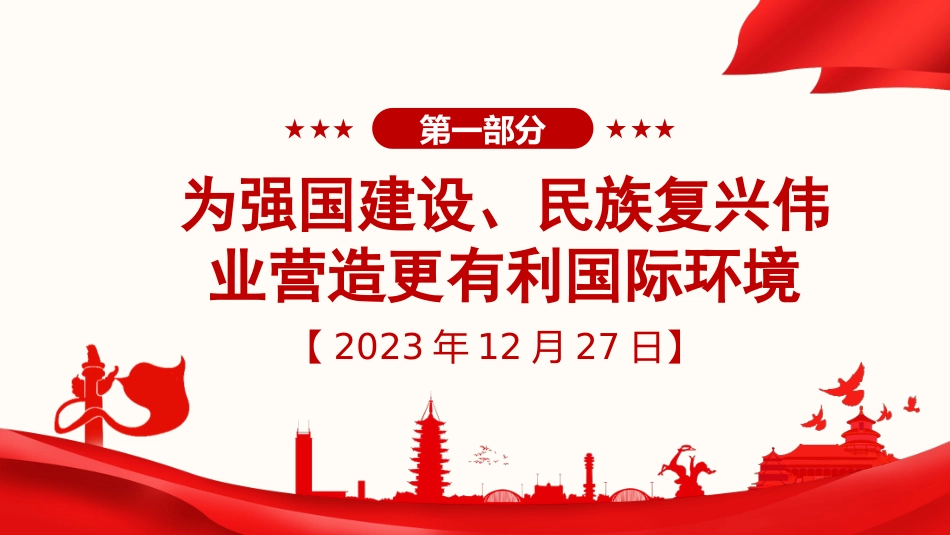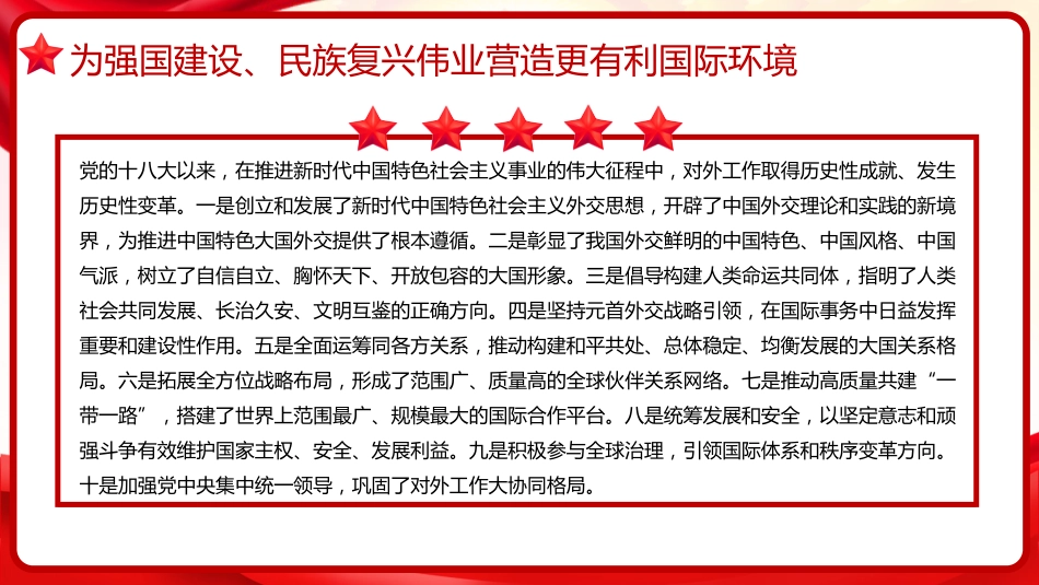 【第十四章】治國理政第五卷全文學(xué)習(xí)開創(chuàng)中國特色大國外交新局面匯報人:xx匯報時間:20XX第一部分為強(qiáng)國建設(shè)、民族復(fù)興偉業(yè)營造更有利國際環(huán)境【2023年12月27日】版權(quán)歸屬xi87.cn,官網(wǎng)xi87.cn為強(qiáng)國建設(shè)、民族復(fù)興偉業(yè)營造更有利國際環(huán)境黨的十八大以來,在推進(jìn)新時代中國特色社會主義事業(yè)的偉大征程中,對外工作取得歷史性成就、發(fā)生歷史性變革。一是創(chuàng)立和發(fā)展了新時代中國特色社會主義外交思想,開辟了中國外交理論和實踐的新境界,為推進(jìn)中國特色大國外交提供了根本遵循。二是彰顯了我國外交鮮明的中國特色、中國風(fēng)格、中國氣派,樹立了自信自立、胸懷天下、開放包...