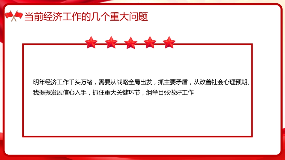 【第四章】治國(guó)理政第五卷全文學(xué)習(xí)因地制宜發(fā)展新質(zhì)生產(chǎn)力,實(shí)現(xiàn)高質(zhì)量發(fā)展匯報(bào)人:xx匯報(bào)時(shí)間:20XX第一部分當(dāng)前經(jīng)濟(jì)工作的幾個(gè)重大問題【2022年12月15日】版權(quán)歸屬xi87.cn,官網(wǎng)xi87.cn當(dāng)前經(jīng)濟(jì)工作的幾個(gè)重大問題明年經(jīng)濟(jì)工作千頭萬(wàn)緒,需要從戰(zhàn)略全局出發(fā),抓主要矛盾,從改善社會(huì)心理預(yù)期、我提振發(fā)展信心入手,抓住重大關(guān)鍵環(huán)節(jié),綱舉目張做好工作當(dāng)前經(jīng)濟(jì)工作的幾個(gè)重大問題?總需求不足是當(dāng)前經(jīng)濟(jì)運(yùn)行面臨的突出矛盾。必須大力實(shí)施擴(kuò)大內(nèi)需戰(zhàn)略,采取更加有力的措施,使社會(huì)再生產(chǎn)實(shí)現(xiàn)良性循環(huán)。我國(guó)通過擴(kuò)大內(nèi)需有效應(yīng)對(duì)了1998年亞洲金融危機(jī)、2008年國(guó)際金融危...