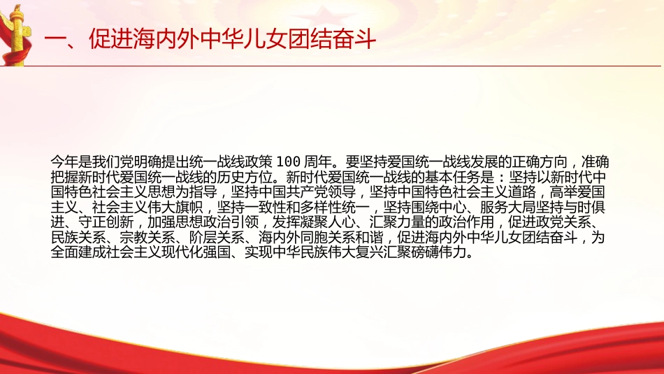 治國(guó)理政第五卷全文學(xué)習(xí)授課人:【公%眾#號(hào):老&船#長(zhǎng)%素*材庫(kù)】大力發(fā)展全過(guò)程人民民主【第六章】版權(quán)歸屬xi87.cn,官網(wǎng)xi87.cn促進(jìn)海內(nèi)外中華兒女團(tuán)結(jié)奮斗第一部分【2022年7月29日】版權(quán)歸屬xi87.cn,官網(wǎng)xi87.cn一、促進(jìn)海內(nèi)外中華兒女團(tuán)結(jié)奮斗今年是我們黨明確提出統(tǒng)一戰(zhàn)線政策100周年。要堅(jiān)持愛(ài)國(guó)統(tǒng)一戰(zhàn)線發(fā)展的正確方向,準(zhǔn)確把握新時(shí)代愛(ài)國(guó)統(tǒng)一戰(zhàn)線的歷史方位。新時(shí)代愛(ài)國(guó)統(tǒng)一戰(zhàn)線的基本任務(wù)是:堅(jiān)持以新時(shí)代中國(guó)特色社會(huì)主義思想為指導(dǎo),堅(jiān)持中國(guó)共產(chǎn)黨領(lǐng)導(dǎo),堅(jiān)持中國(guó)特色社會(huì)主義道路,高舉愛(ài)國(guó)主義、社會(huì)主義偉大旗幟,堅(jiān)持一致性和多樣性統(tǒng)一,堅(jiān)持圍繞中心、...