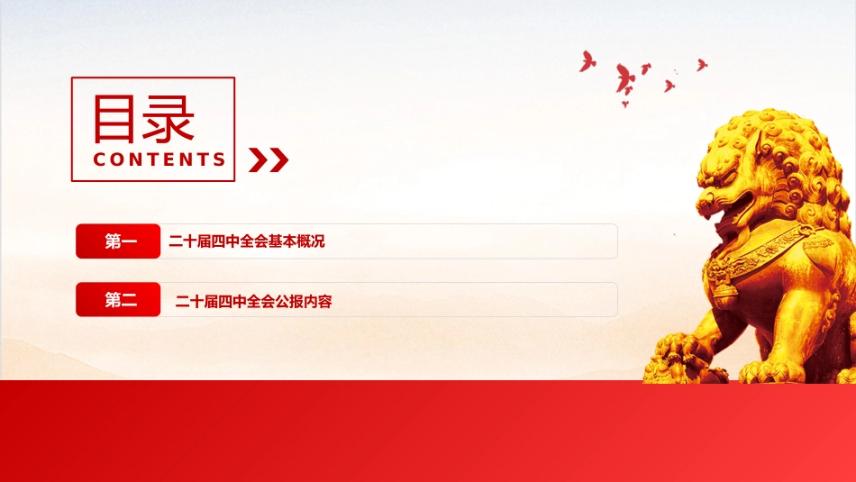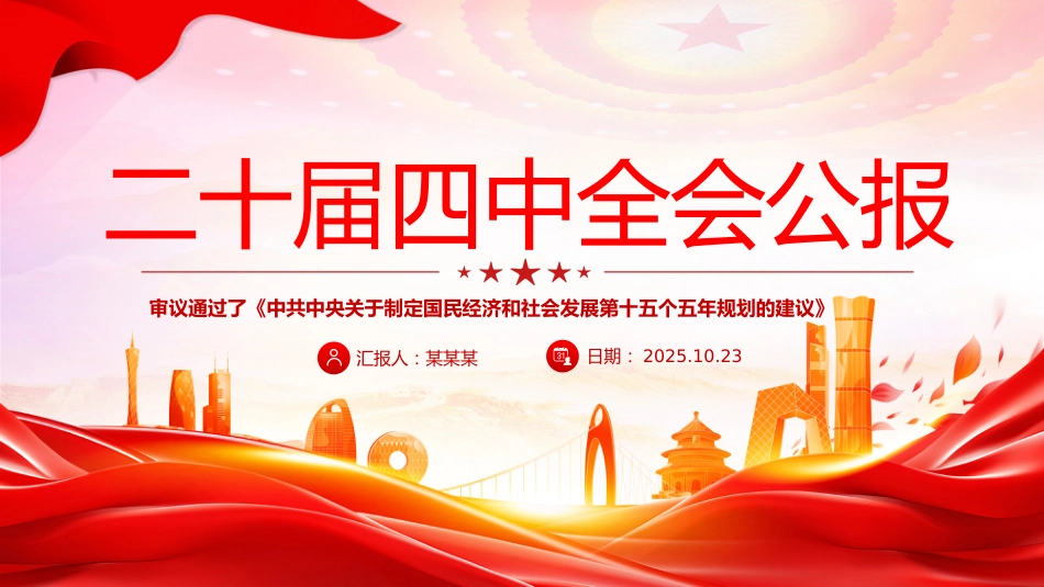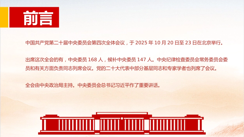 二十屆四中全會公報審議通過了《中共中央關(guān)于制定國民經(jīng)濟(jì)和社會發(fā)展第十五個五年規(guī)劃的建議》匯報人:某某某日期:2025.10.23前言中國共產(chǎn)黨第二十屆中央委員會第四次全體會議,于2025年10月20日至23日在北京舉行。出席這次全會的有,中央委員168人,候補(bǔ)中央委員147人。中央紀(jì)律檢查委員會常務(wù)委員會委員和有關(guān)方面負(fù)責(zé)同志列席會議。黨的二十大代表中部分基層同志和專家學(xué)者也列席了會議。全會由中央政治局主持。中央委員會總書記習(xí)近平作了重要講話。目錄CONTENTS第一二十屆四中全會基本概況第二二十屆四中全會公報內(nèi)容第一部分二十屆四中全會基本概況第一部分二十屆...