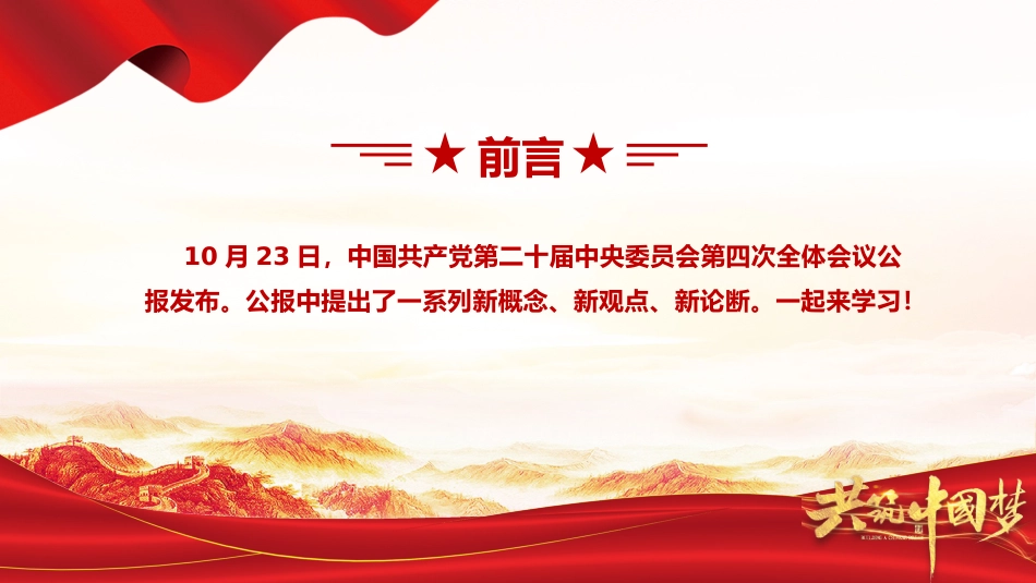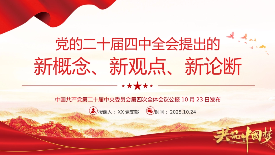 授課人:XX黨支部時間:2025.10.24黨的二十屆四中全會提出的新概念、新觀點、新論斷中國共產(chǎn)黨第二十屆中央委員會第四次全體會議公報10月23日發(fā)布前言10月23日,中國共產(chǎn)黨第二十屆中央委員會第四次全體會議公報發(fā)布。公報中提出了一系列新概念、新觀點、新論斷。一起來學(xué)習(xí)!3二十屆四中全會提出的新概念、新觀點、新論斷實現(xiàn)社會主義現(xiàn)代化是一個階梯式遞進、不斷發(fā)展進步的歷史過程,需要不懈努力、接續(xù)奮斗?!笆逦濉睍r期是基本實現(xiàn)社會主義現(xiàn)代化夯實基礎(chǔ)、全面發(fā)力的關(guān)鍵時期,在基本實現(xiàn)社會主義現(xiàn)代化進程中具有承前啟后的重要地位?!笆逦濉睍r期我國發(fā)展環(huán)...