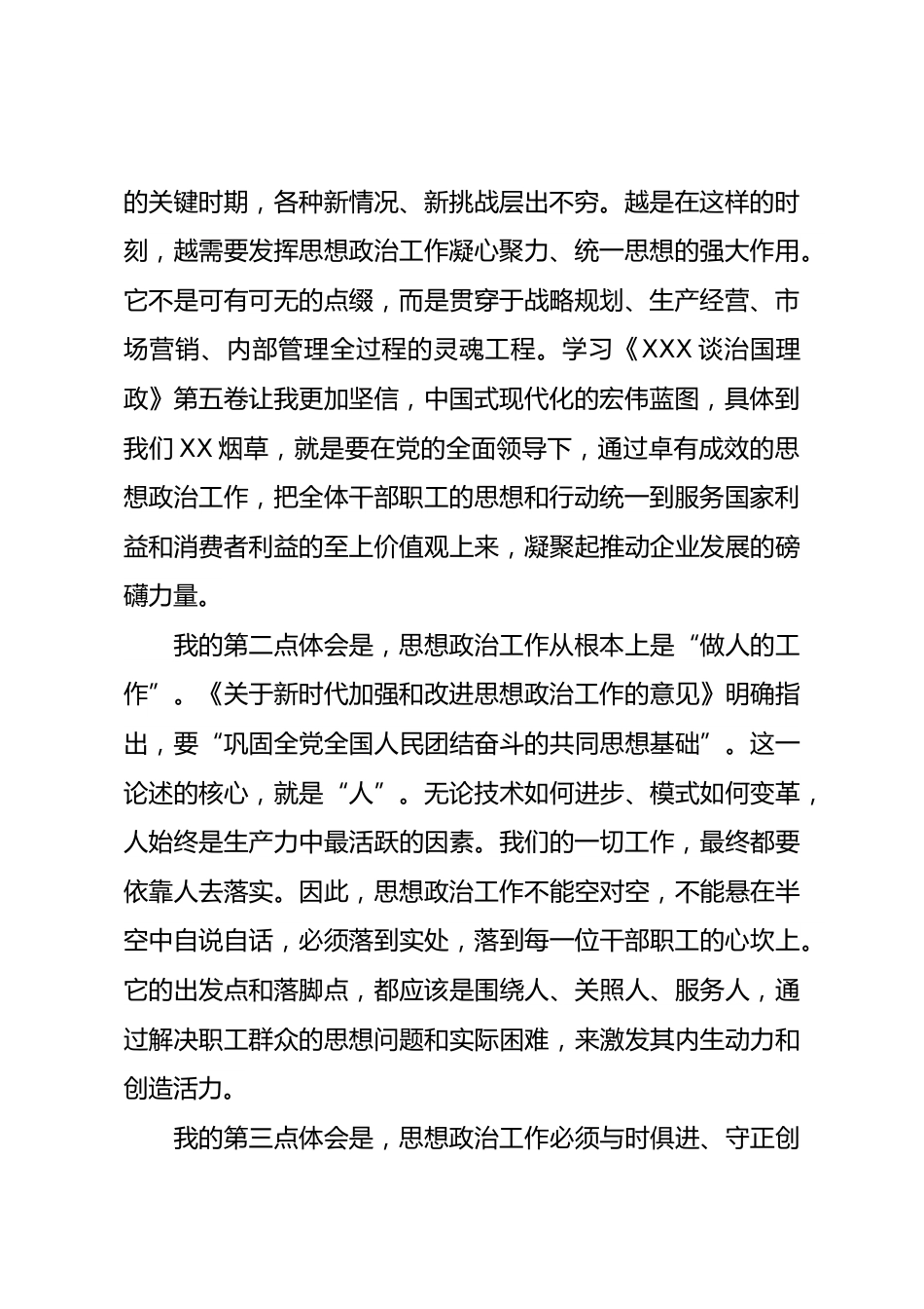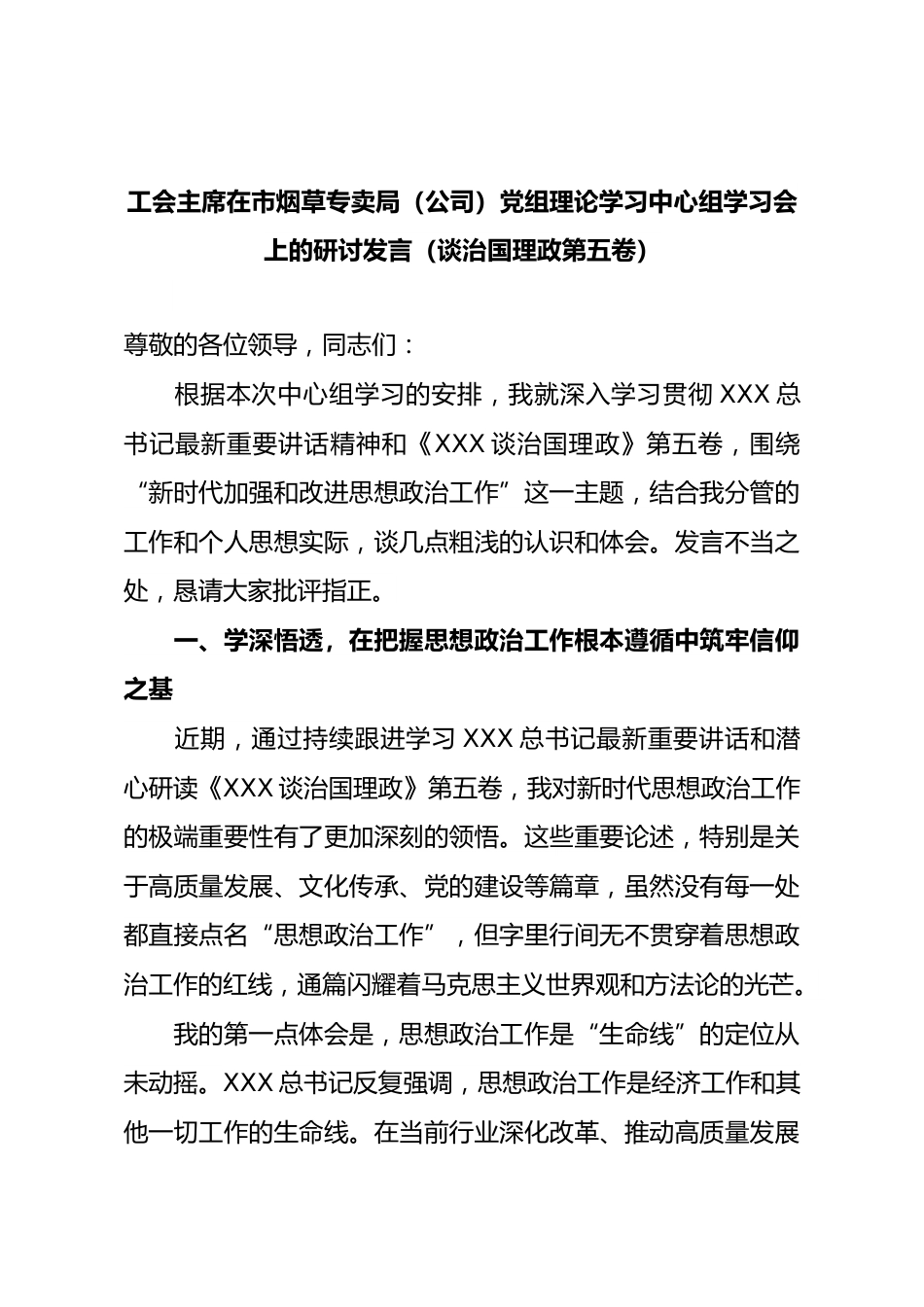 工會(huì)主席在市煙草專賣局(公司)黨組理論學(xué)習(xí)中心組學(xué)習(xí)會(huì)上的研討發(fā)言(談治國理政第五卷)尊敬的各位領(lǐng)導(dǎo),同志們:根據(jù)本次中心組學(xué)習(xí)的安排,我就深入學(xué)習(xí)貫徹XXX總書記最新重要講話精神和《XXX談治國理政》第五卷,圍繞“新時(shí)代加強(qiáng)和改進(jìn)思想政治工作”這一主題,結(jié)合我分管的工作和個(gè)人思想實(shí)際,談幾點(diǎn)粗淺的認(rèn)識(shí)和體會(huì)。發(fā)言不當(dāng)之處,懇請(qǐng)大家批評(píng)指正。一、學(xué)深悟透,在把握思想政治工作根本遵循中筑牢信仰之基近期,通過持續(xù)跟進(jìn)學(xué)習(xí)XXX總書記最新重要講話和潛心研讀《XXX談治國理政》第五卷,我對(duì)新時(shí)代思想政治工作的極端重要性有了更加深刻的領(lǐng)悟。這些重...