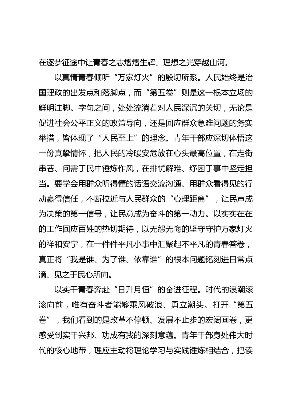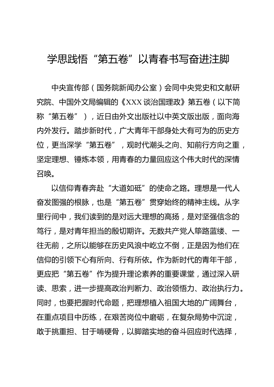 學(xué)思踐悟“第五卷”以青春書寫奮進(jìn)注腳中央宣傳部(國務(wù)院新聞辦公室)會(huì)同中央黨史和文獻(xiàn)研究院、中國外文局編輯的《XXX談治國理政》第五卷(以下簡稱“第五卷”),近日由外文出版社以中英文版出版,面向海內(nèi)外發(fā)行。踏步新時(shí)代,廣大青年干部身處大有可為的歷史方位,更當(dāng)深學(xué)“第五卷”,觀時(shí)代潮頭之向、知前行方向之重,堅(jiān)定理想、錘煉本領(lǐng),用青春的力量回應(yīng)這個(gè)偉大時(shí)代的深情召喚。以信仰青春奔赴“大道如砥”的使命之路。理想是一代人奮發(fā)圖強(qiáng)的根脈,也是“第五卷”貫穿始終的精神主線。從字里行間中,我們讀到的是對(duì)遠(yuǎn)大理想的高揚(yáng),是對(duì)堅(jiān)強(qiáng)信念的篤行,是...