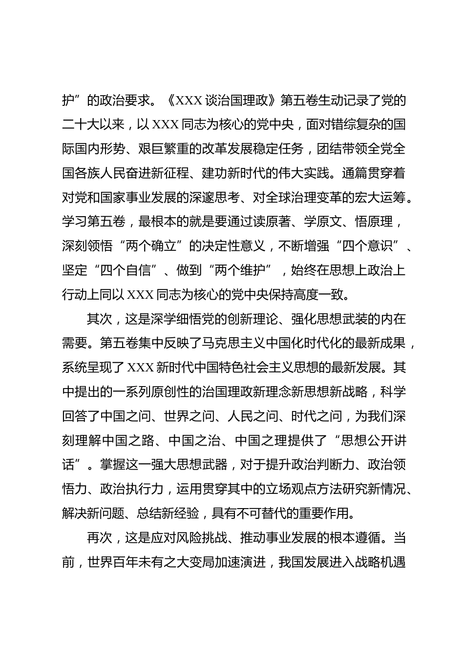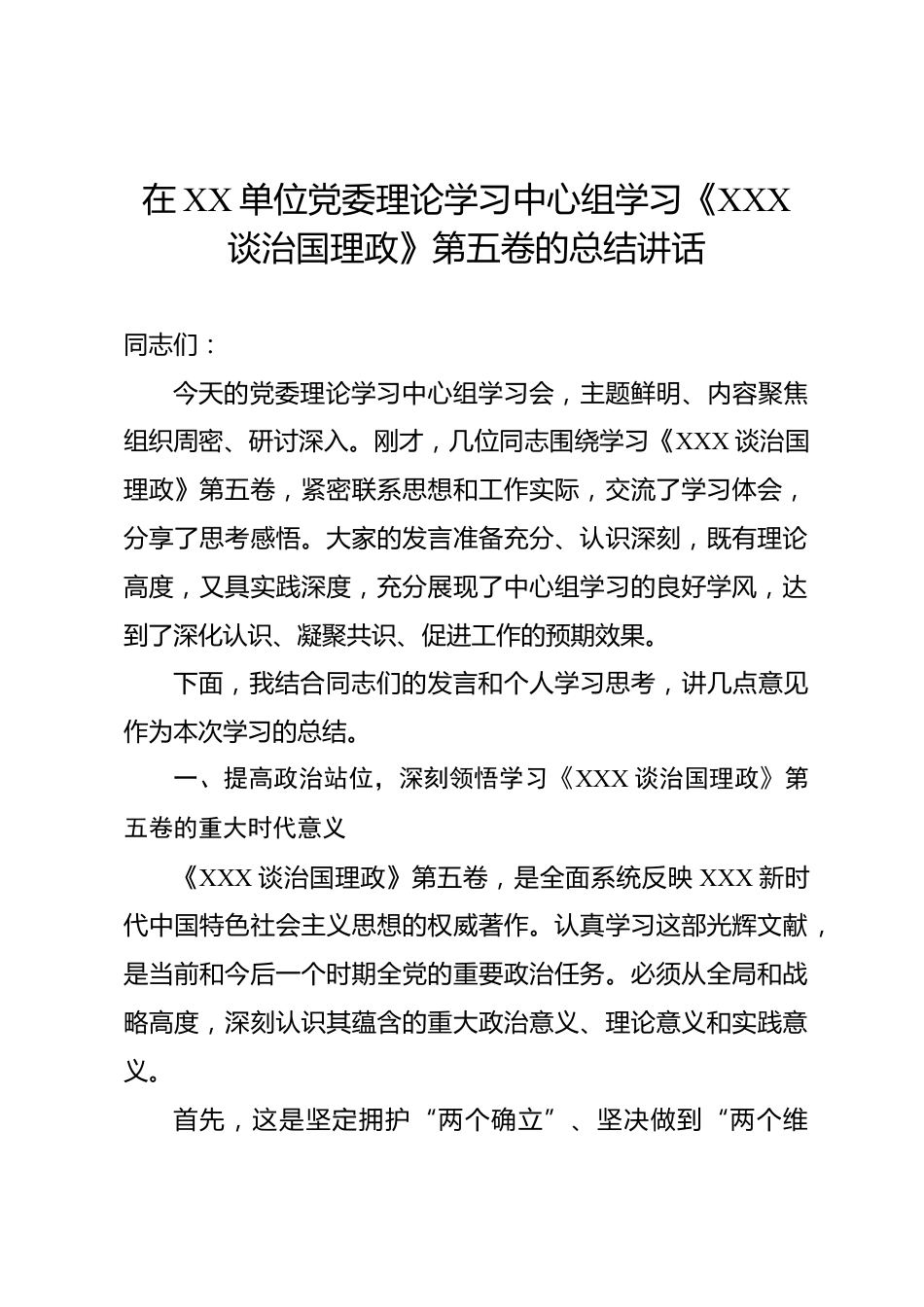 在XX單位黨委理論學習中心組學習《XXX談治國理政》第五卷的總結(jié)講話同志們:今天的黨委理論學習中心組學習會,主題鮮明、內(nèi)容聚焦組織周密、研討深入。剛才,幾位同志圍繞學習《XXX談治國理政》第五卷,緊密聯(lián)系思想和工作實際,交流了學習體會,分享了思考感悟。大家的發(fā)言準備充分、認識深刻,既有理論高度,又具實踐深度,充分展現(xiàn)了中心組學習的良好學風,達到了深化認識、凝聚共識、促進工作的預期效果。下面,我結(jié)合同志們的發(fā)言和個人學習思考,講幾點意見作為本次學習的總結(jié)。一、提高政治站位,深刻領(lǐng)悟?qū)W習《XXX談治國理政》第五卷的重大時代意義《XXX談治國理...