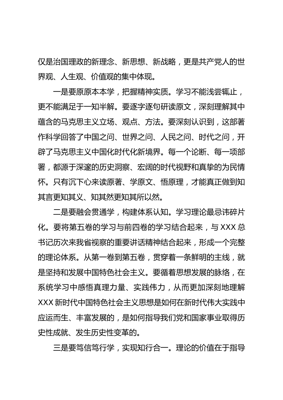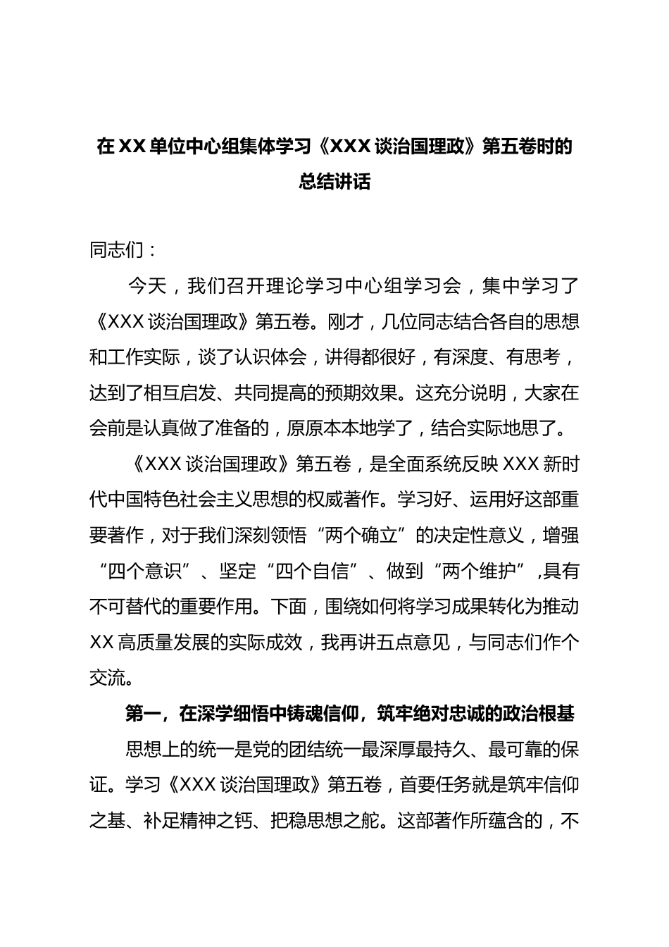 在XX單位中心組集體學習《XXX談治國理政》第五卷時的總結講話同志們:今天,我們召開理論學習中心組學習會,集中學習了《XXX談治國理政》第五卷。剛才,幾位同志結合各自的思想和工作實際,談了認識體會,講得都很好,有深度、有思考,達到了相互啟發(fā)、共同提高的預期效果。這充分說明,大家在會前是認真做了準備的,原原本本地學了,結合實際地思了?!禭XX談治國理政》第五卷,是全面系統(tǒng)反映XXX新時代中國特色社會主義思想的權威著作。學習好、運用好這部重要著作,對于我們深刻領悟“兩個確立”的決定性意義,增強“四個意識”、堅定“四個自信”、做到“兩個維護”,...