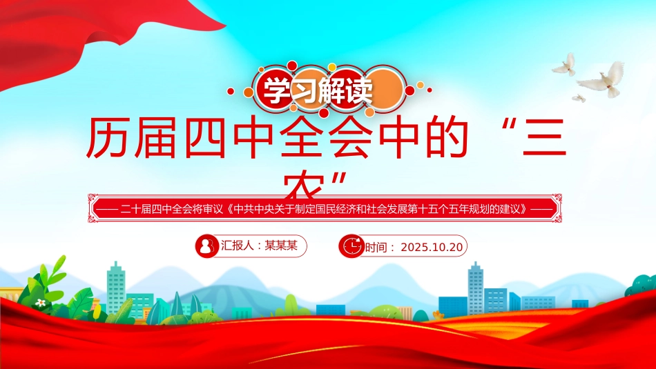 歷屆四中全會(huì)中的“三農(nóng)”——二十屆四中全會(huì)將審議《中共中央關(guān)于制定國(guó)民經(jīng)濟(jì)和社會(huì)發(fā)展第十五個(gè)五年規(guī)劃的建議》——學(xué)習(xí)解讀匯報(bào)人:某某某時(shí)間:2025.10.2010月20日至23日,黨的二十屆四中全會(huì)在北京召開。這次會(huì)議之所以受到各方廣泛關(guān)注,因?yàn)樗鼘?duì)未來(lái)五年,中國(guó)經(jīng)濟(jì)和社會(huì)發(fā)展的走向有一個(gè)系統(tǒng)性描繪,會(huì)上將審議《中共中央關(guān)于制定國(guó)民經(jīng)濟(jì)和社會(huì)發(fā)展第十五個(gè)五年規(guī)劃的建議》。這一走向,不僅關(guān)乎中國(guó),也會(huì)影響世界;不僅表現(xiàn)在國(guó)家宏觀敘事上,也直接關(guān)系到億萬(wàn)老百姓具體細(xì)微的生活。黨的二十屆四中全會(huì)會(huì)期4天,從10月20日到23日?;仡櫄v屆四中全會(huì),從召...