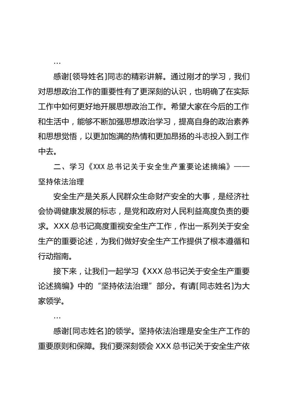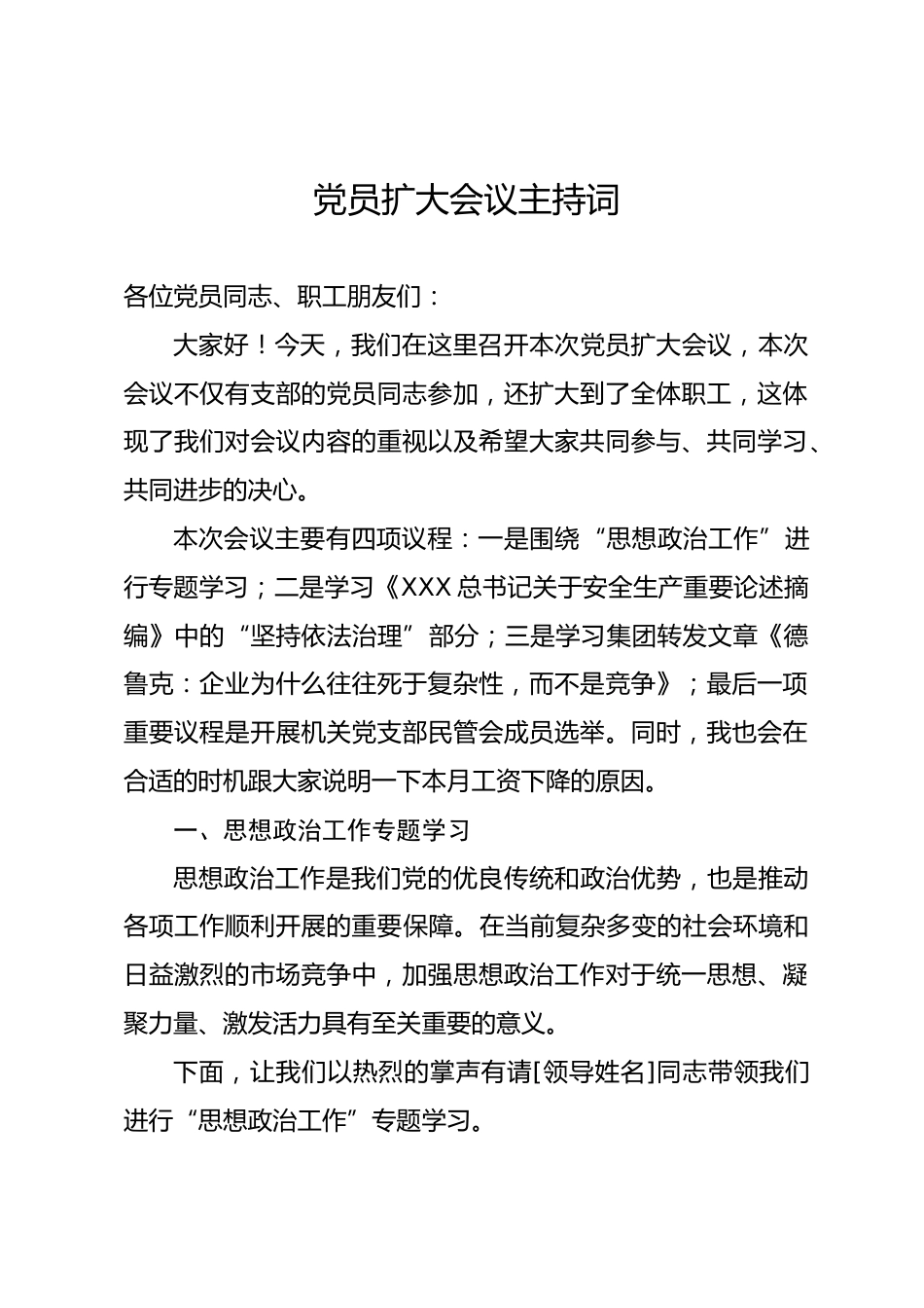 黨員擴(kuò)大會(huì)議主持詞各位黨員同志、職工朋友們:大家好!今天,我們在這里召開本次黨員擴(kuò)大會(huì)議,本次會(huì)議不僅有支部的黨員同志參加,還擴(kuò)大到了全體職工,這體現(xiàn)了我們對(duì)會(huì)議內(nèi)容的重視以及希望大家共同參與、共同學(xué)習(xí)、共同進(jìn)步的決心。本次會(huì)議主要有四項(xiàng)議程:一是圍繞“思想政治工作”進(jìn)行專題學(xué)習(xí);二是學(xué)習(xí)《XXX總書記關(guān)于安全生產(chǎn)重要論述摘編》中的“堅(jiān)持依法治理”部分;三是學(xué)習(xí)集團(tuán)轉(zhuǎn)發(fā)文章《德魯克:企業(yè)為什么往往死于復(fù)雜性,而不是競爭》;最后一項(xiàng)重要議程是開展機(jī)關(guān)黨支部民管會(huì)成員選舉。同時(shí),我也會(huì)在合適的時(shí)機(jī)跟大家說明一下本月工資下降的原因。...