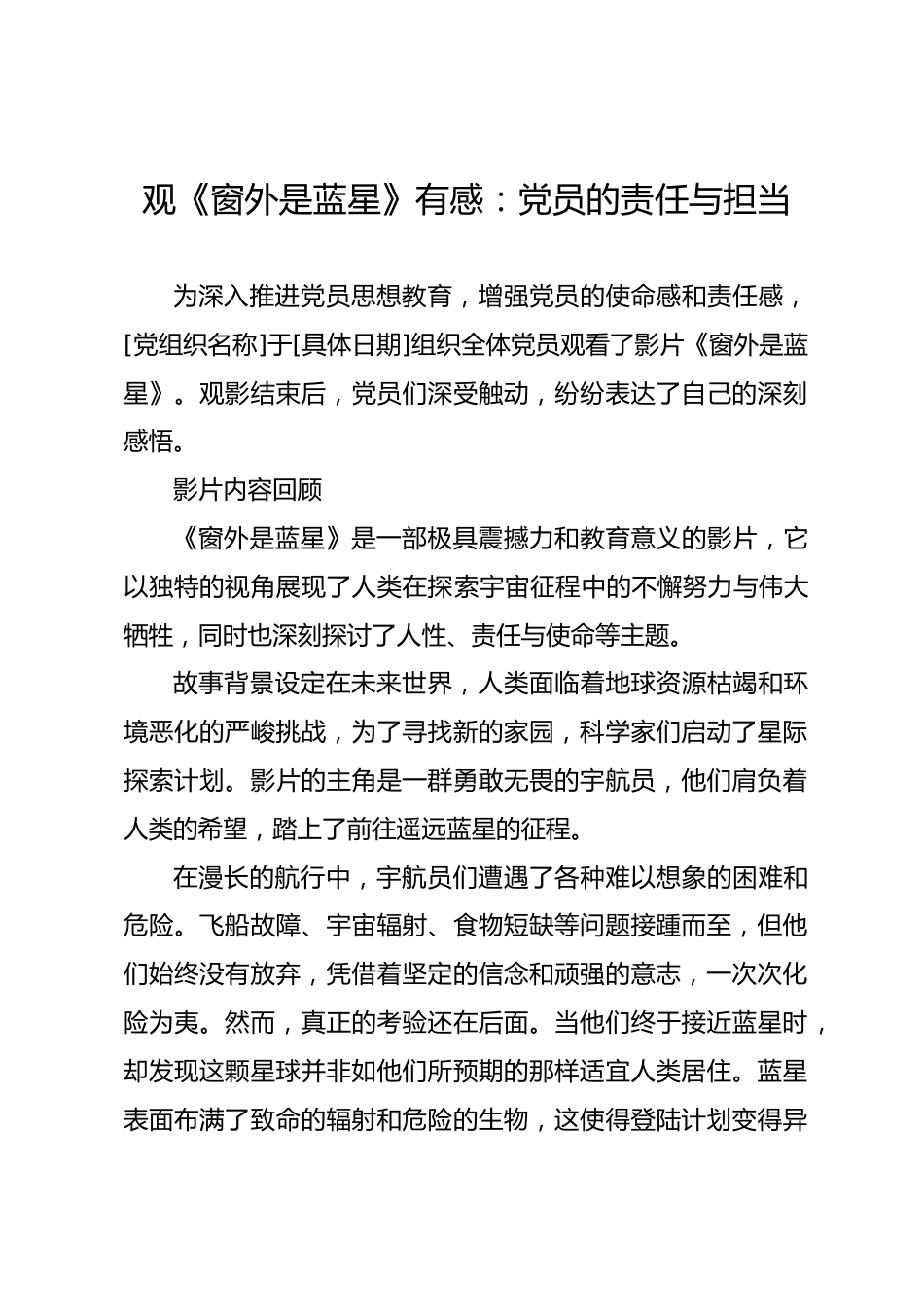觀《窗外是藍(lán)星》有感:黨員的責(zé)任與擔(dān)當(dāng)為深入推進(jìn)黨員思想教育,增強(qiáng)黨員的使命感和責(zé)任感,[黨組織名稱]于[具體日期]組織全體黨員觀看了影片《窗外是藍(lán)星》。觀影結(jié)束后,黨員們深受觸動(dòng),紛紛表達(dá)了自己的深刻感悟。影片內(nèi)容回顧《窗外是藍(lán)星》是一部極具震撼力和教育意義的影片,它以獨(dú)特的視角展現(xiàn)了人類在探索宇宙征程中的不懈努力與偉大犧牲,同時(shí)也深刻探討了人性、責(zé)任與使命等主題。故事背景設(shè)定在未來(lái)世界,人類面臨著地球資源枯竭和環(huán)境惡化的嚴(yán)峻挑戰(zhàn),為了尋找新的家園,科學(xué)家們啟動(dòng)了星際探索計(jì)劃。影片的主角是一群勇敢無(wú)畏的宇航員,他們肩負(fù)著人類的...