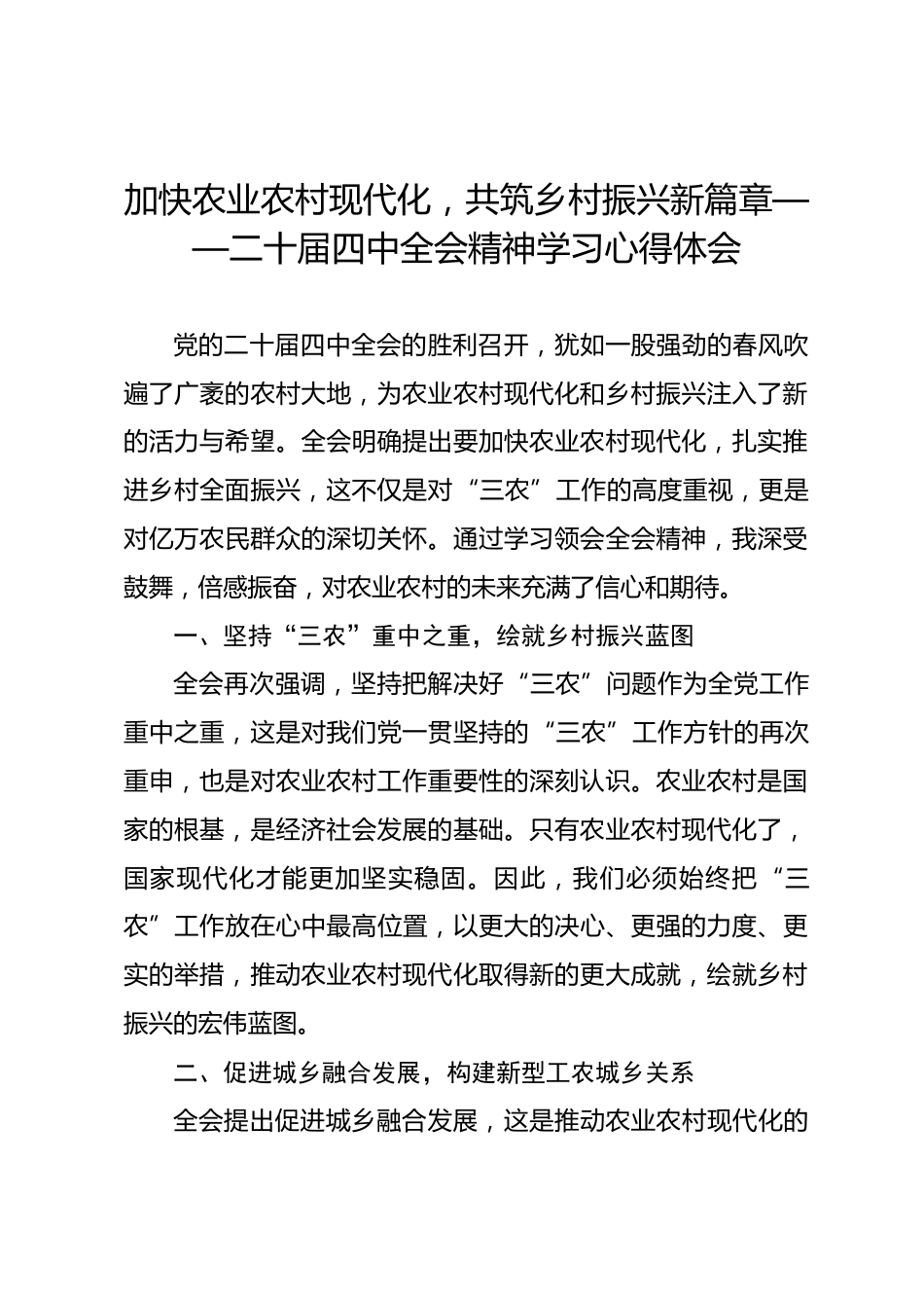加快農(nóng)業(yè)農(nóng)村現(xiàn)代化,共筑鄉(xiāng)村振興新篇章——二十屆四中全會精神學(xué)習(xí)心得體會