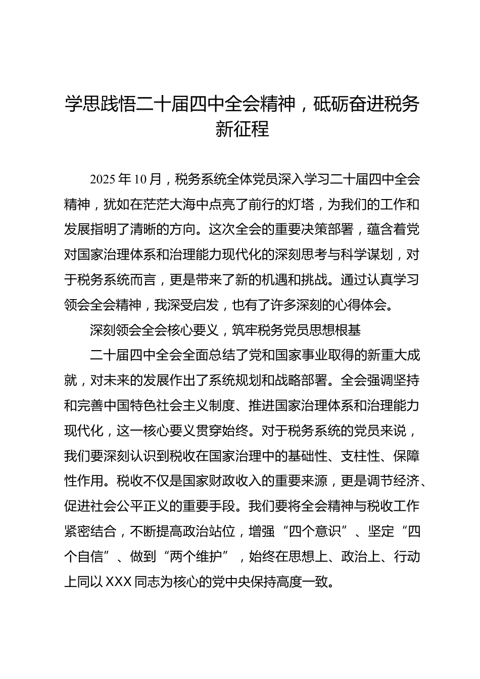 學(xué)思踐悟二十屆四中全會(huì)精神,砥礪奮進(jìn)稅務(wù)新征程2025年10月,稅務(wù)系統(tǒng)全體黨員深入學(xué)習(xí)二十屆四中全會(huì)精神,猶如在茫茫大海中點(diǎn)亮了前行的燈塔,為我們的工作和發(fā)展指明了清晰的方向。這次全會(huì)的重要決策部署,蘊(yùn)含著黨對(duì)國(guó)家治理體系和治理能力現(xiàn)代化的深刻思考與科學(xué)謀劃,對(duì)于稅務(wù)系統(tǒng)而言,更是帶來(lái)了新的機(jī)遇和挑戰(zhàn)。通過(guò)認(rèn)真學(xué)習(xí)領(lǐng)會(huì)全會(huì)精神,我深受啟發(fā),也有了許多深刻的心得體會(huì)。深刻領(lǐng)會(huì)全會(huì)核心要義,筑牢稅務(wù)黨員思想根基二十屆四中全會(huì)全面總結(jié)了黨和國(guó)家事業(yè)取得的新重大成就,對(duì)未來(lái)的發(fā)展作出了系統(tǒng)規(guī)劃和戰(zhàn)略部署。全會(huì)強(qiáng)調(diào)堅(jiān)持和完善中國(guó)特色社會(huì)主...