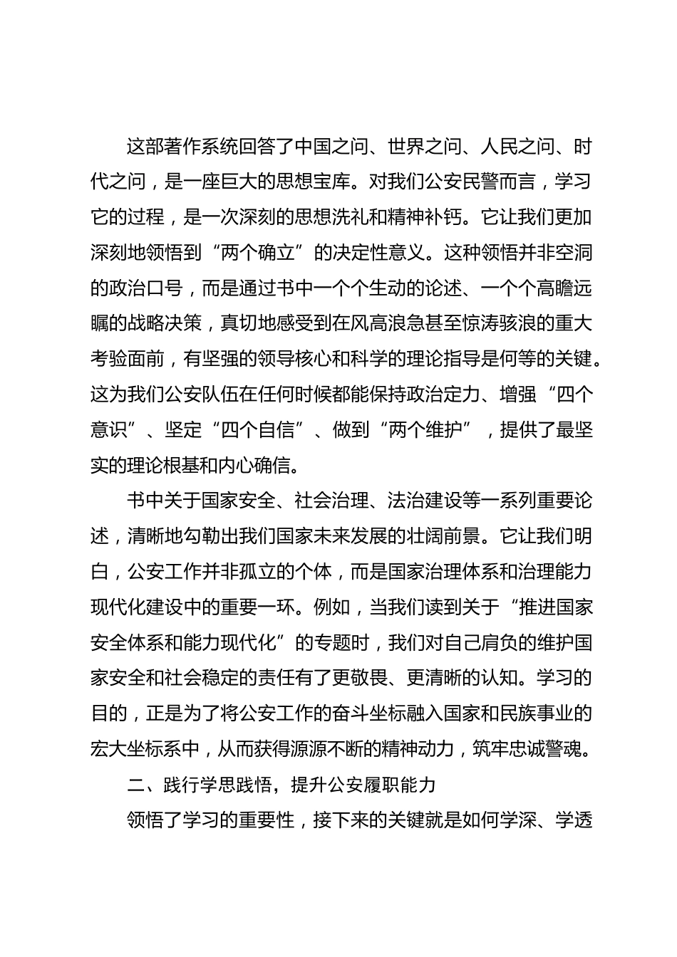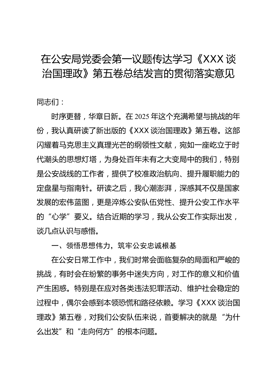 在公安局黨委會(huì)第一議題傳達(dá)學(xué)習(xí)《XXX談治國理政》第五卷總結(jié)發(fā)言的貫徹落實(shí)意見同志們:時(shí)序更替,華章日新。在2025年這個(gè)充滿希望與挑戰(zhàn)的年份,我認(rèn)真研讀了新出版的《XXX談治國理政》第五卷。這部閃耀著馬克思主義真理光芒的綱領(lǐng)性文獻(xiàn),宛如一座屹立于時(shí)代潮頭的思想燈塔,為身處百年未有之大變局中的我們,特別是公安戰(zhàn)線的工作者,提供了校準(zhǔn)政治航向、提升履職能力的定盤星與指南針。研讀之后,我心潮澎湃,深感其不僅是國家發(fā)展的宏偉藍(lán)圖,更是淬煉公安隊(duì)伍黨性、提升公安工作水平的“心學(xué)”要義。結(jié)合近期的學(xué)習(xí),我從公安工作實(shí)際出發(fā),談幾點(diǎn)認(rèn)識(shí)與感悟。一...