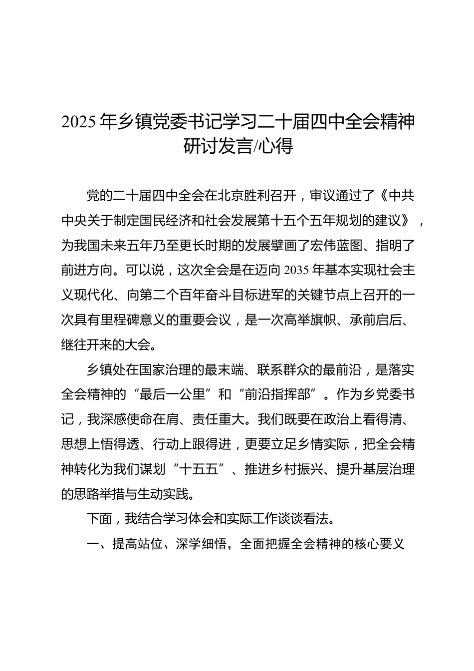 2025年鄉(xiāng)鎮(zhèn)黨委書記學(xué)習(xí)二十屆四中全會精神研討發(fā)言