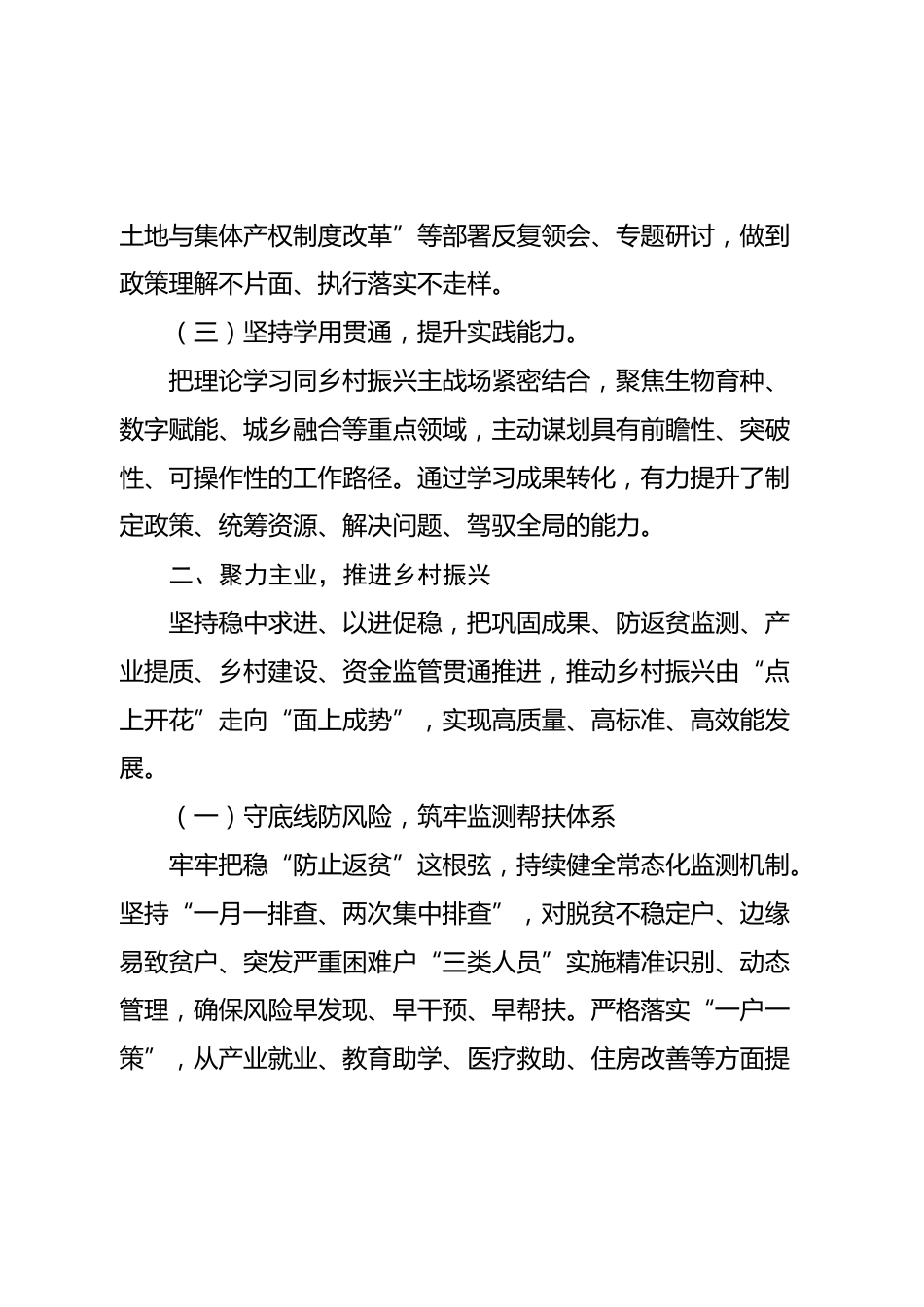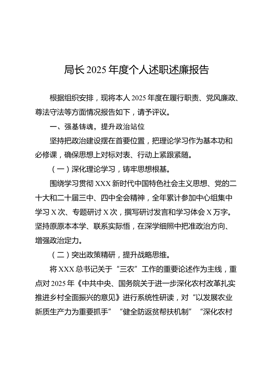 局長2025年度個人述職述廉報告根據(jù)組織安排,現(xiàn)將本人2025年度在履行職責(zé)、黨風(fēng)廉政、尊法守法等方面情況報告如下,請予評議。一、強基鑄魂,提升政治站位堅持把政治建設(shè)擺在首要位置,把理論學(xué)習(xí)作為基本功和必修課,確保思想上對標(biāo)對表、行動上緊跟緊隨。(一)深化理論學(xué)習(xí),鑄牢思想根基。圍繞學(xué)習(xí)貫徹XXX新時代中國特色社會主義思想、黨的二十大和二十屆三中、四中全會精神,全年累計參加中心組集中學(xué)習(xí)X次、專題研討X次,撰寫研討發(fā)言和學(xué)習(xí)體會X萬字。堅持原原本本學(xué)、聯(lián)系實際悟,在深學(xué)細(xì)照中把準(zhǔn)政治方向、增強政治定力。(二)突出政策精研,提升戰(zhàn)略思維。將...