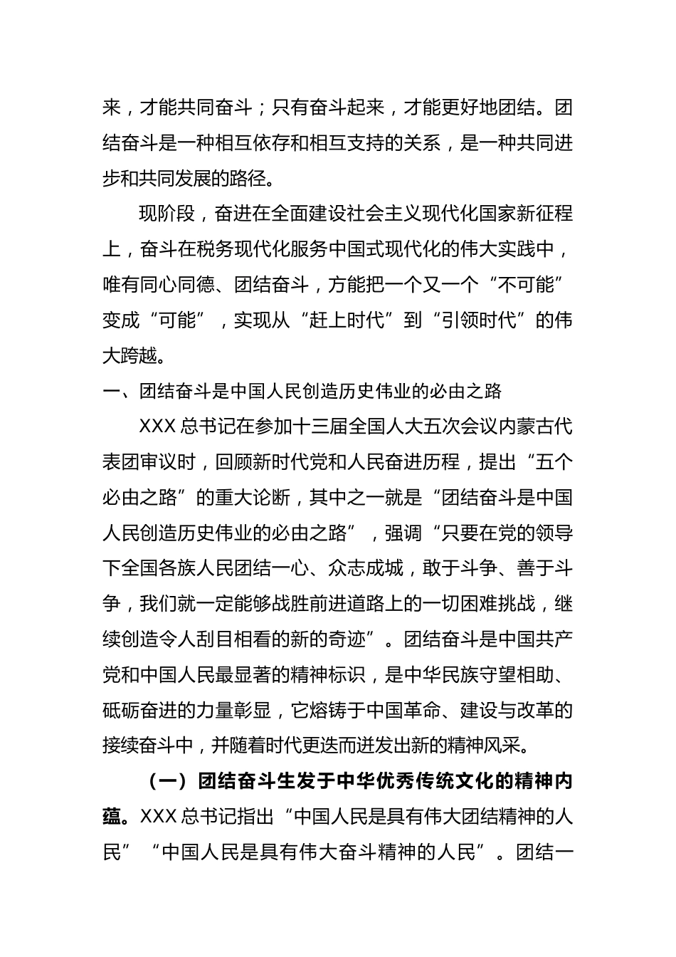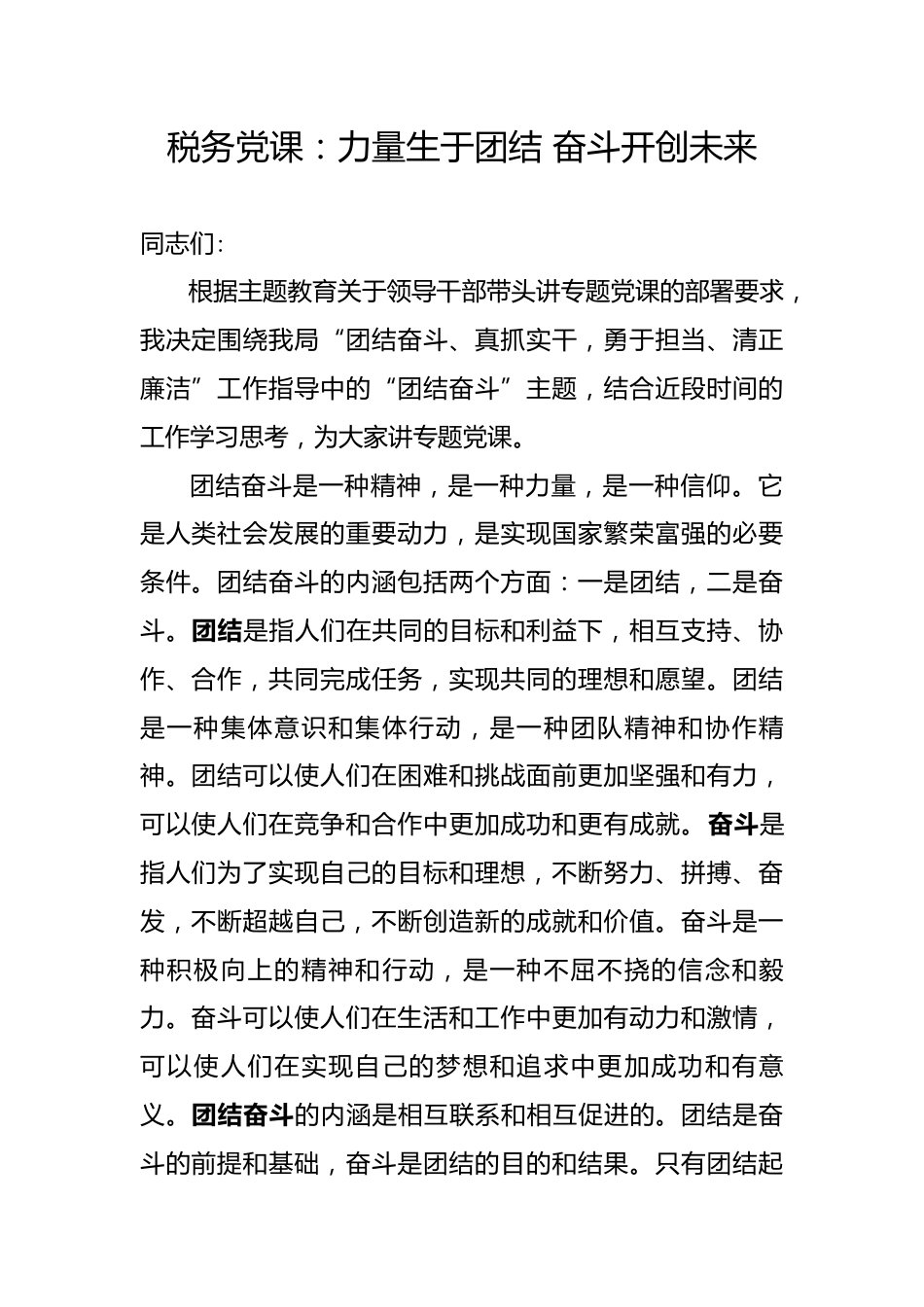 稅務(wù)黨課:力量生于團結(jié)奮斗開創(chuàng)未來同志們:根據(jù)主題教育關(guān)于領(lǐng)導(dǎo)干部帶頭講專題黨課的部署要求,我決定圍繞我局“團結(jié)奮斗、真抓實干,勇于擔(dān)當(dāng)、清正廉潔”工作指導(dǎo)中的“團結(jié)奮斗”主題,結(jié)合近段時間的工作學(xué)習(xí)思考,為大家講專題黨課。團結(jié)奮斗是一種精神,是一種力量,是一種信仰。它是人類社會發(fā)展的重要動力,是實現(xiàn)國家繁榮富強的必要條件。團結(jié)奮斗的內(nèi)涵包括兩個方面:一是團結(jié),二是奮斗。團結(jié)是指人們在共同的目標和利益下,相互支持、協(xié)作、合作,共同完成任務(wù),實現(xiàn)共同的理想和愿望。團結(jié)是一種集體意識和集體行動,是一種團隊精神和協(xié)作精神。團結(jié)可以...