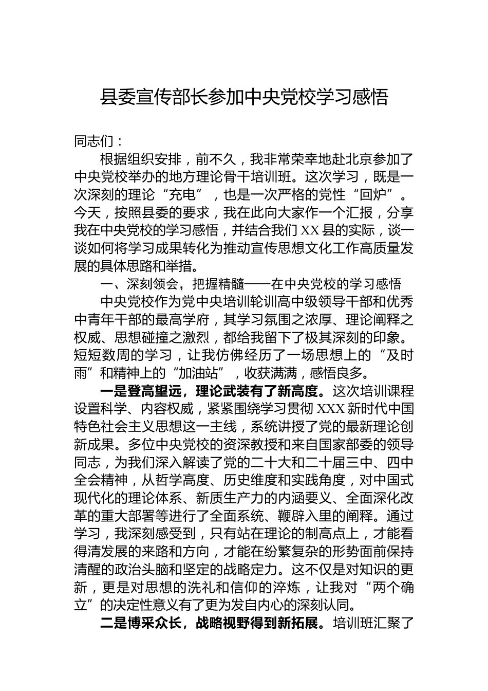 縣委宣傳部長參加中央黨校學(xué)習(xí)感悟同志們:根據(jù)組織安排,前不久,我非常榮幸地赴北京參加了中央黨校舉辦的地方理論骨干培訓(xùn)班。這次學(xué)習(xí),既是一次深刻的理論“充電”,也是一次嚴(yán)格的黨性“回爐”。今天,按照縣委的要求,我在此向大家作一個(gè)匯報(bào),分享我在中央黨校的學(xué)習(xí)感悟,并結(jié)合我們XX縣的實(shí)際,談一談如何將學(xué)習(xí)成果轉(zhuǎn)化為推動(dòng)宣傳思想文化工作高質(zhì)量發(fā)展的具體思路和舉措。一、深刻領(lǐng)會(huì),把握精髓——在中央黨校的學(xué)習(xí)感悟中央黨校作為黨中央培訓(xùn)輪訓(xùn)高中級(jí)領(lǐng)導(dǎo)干部和優(yōu)秀中青年干部的最高學(xué)府,其學(xué)習(xí)氛圍之濃厚、理論闡釋之權(quán)威、思想碰撞之激烈,都給我留下...