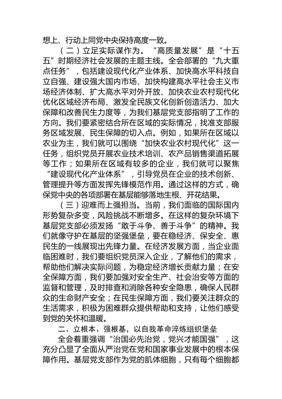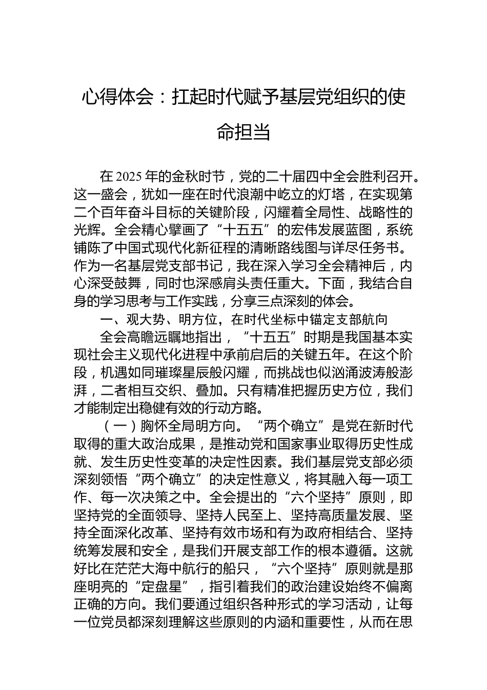 心得體會(huì):扛起時(shí)代賦予基層黨組織的使命擔(dān)當(dāng)在2025年的金秋時(shí)節(jié),黨的二十屆四中全會(huì)勝利召開。這一盛會(huì),猶如一座在時(shí)代浪潮中屹立的燈塔,在實(shí)現(xiàn)第二個(gè)百年奮斗目標(biāo)的關(guān)鍵階段,閃耀著全局性、戰(zhàn)略性的光輝。全會(huì)精心擘畫了“十五五”的宏偉發(fā)展藍(lán)圖,系統(tǒng)鋪陳了中國(guó)式現(xiàn)代化新征程的清晰路線圖與詳盡任務(wù)書。作為一名基層黨支部書記,我在深入學(xué)習(xí)全會(huì)精神后,內(nèi)心深受鼓舞,同時(shí)也深感肩頭責(zé)任重大。下面,我結(jié)合自身的學(xué)習(xí)思考與工作實(shí)踐,分享三點(diǎn)深刻的體會(huì)。一、觀大勢(shì)、明方位,在時(shí)代坐標(biāo)中錨定支部航向全會(huì)高瞻遠(yuǎn)矚地指出,“十五五”時(shí)期是我國(guó)基本實(shí)現(xiàn)社會(huì)...