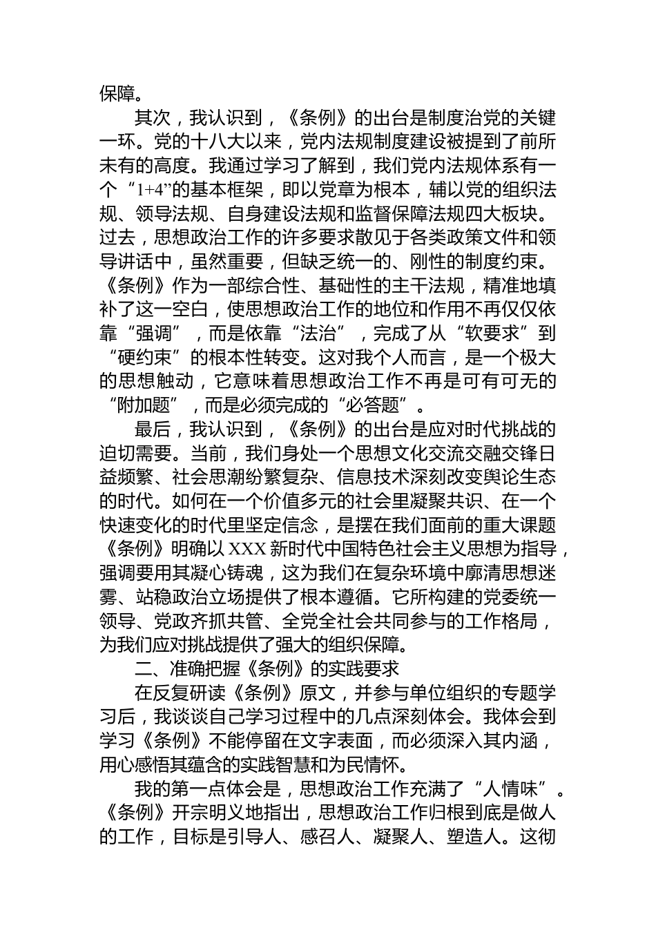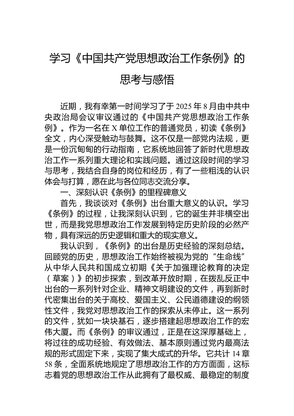 學(xué)習(xí)《中國(guó)共產(chǎn)黨思想政治工作條例》的思考與感悟近期,我有幸第一時(shí)間學(xué)習(xí)了于2025年8月由中共中央政治局會(huì)議審議通過的《中國(guó)共產(chǎn)黨思想政治工作條例》。作為一名在X單位工作的普通黨員,初讀《條例》全文,內(nèi)心深受觸動(dòng)與鼓舞。這不僅是一部黨內(nèi)法規(guī),更是一份沉甸甸的行動(dòng)指南,它系統(tǒng)地回答了新時(shí)代思想政治工作一系列重大理論和實(shí)踐問題。通過這段時(shí)間的學(xué)習(xí)與思考,我結(jié)合自身的崗位和經(jīng)歷,有了一些粗淺的認(rèn)識(shí)體會(huì)與打算,愿在此與各位同志交流分享。一、深刻認(rèn)識(shí)《條例》的里程碑意義首先,我談?wù)剬?duì)《條例》出臺(tái)重大意義的認(rèn)識(shí)。學(xué)習(xí)《條例》的過程,讓我深刻認(rèn)...