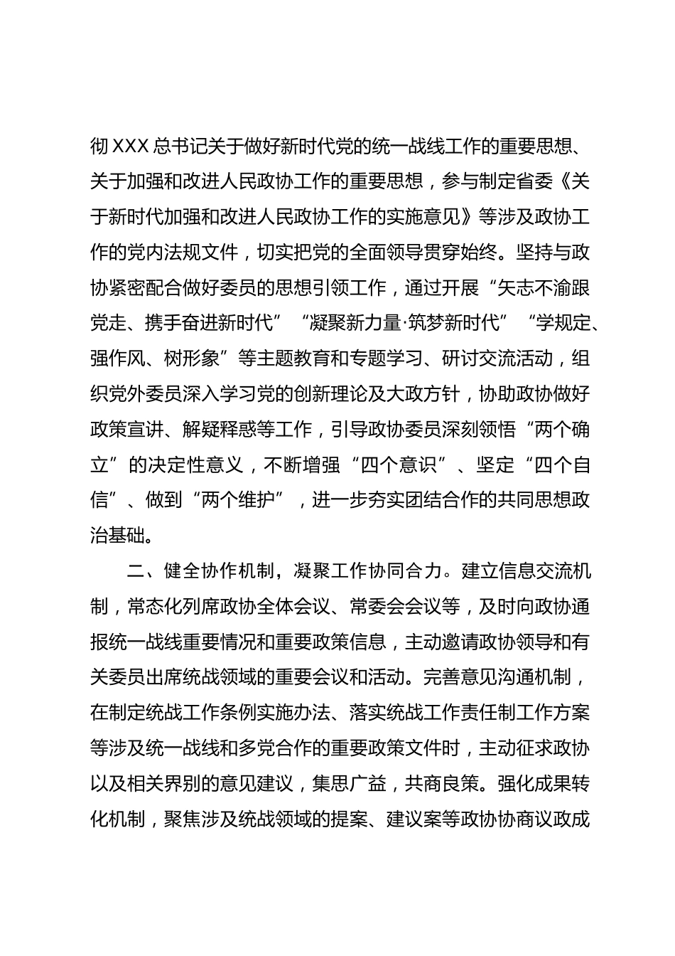 (4篇)在xx委政協(xié)工作會議大會上的發(fā)言材料匯編目錄1.七十五載風雨同行志同道合團結(jié)奮進奮力推動人民政協(xié)事業(yè)高質(zhì)量發(fā)展22.賡續(xù)優(yōu)良傳統(tǒng)勇?lián)穆毷姑?3.抓牢黨的領導全面支持保障開創(chuàng)新時代人民政協(xié)事業(yè)發(fā)展新局面94.突出“三個強化”做到“三個堅持”更好發(fā)揮人民政協(xié)專門協(xié)商機構(gòu)作用12七十五載風雨同行志同道合團結(jié)奮進奮力推動人民政協(xié)事業(yè)高質(zhì)量發(fā)展人民政協(xié)是最廣泛的愛國統(tǒng)一戰(zhàn)線組織,統(tǒng)戰(zhàn)部是黨委主管統(tǒng)一戰(zhàn)線工作的職能部門,相互之間聯(lián)系非常密切,共同服務于鞏固和發(fā)展愛國統(tǒng)一戰(zhàn)線。xx年來,在省委的堅強領導下,省委統(tǒng)戰(zhàn)部始終堅持“大團結(jié)、大聯(lián)合”主題...