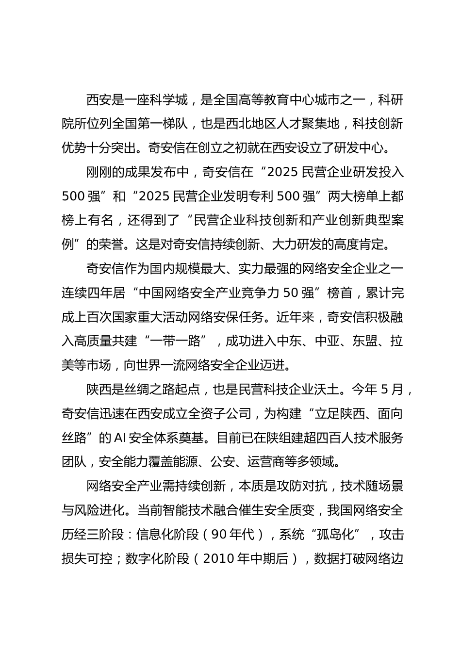 (5篇)2025民營經(jīng)濟創(chuàng)新發(fā)展大會暨知名民企助力陜西高質(zhì)量發(fā)展大會企業(yè)家發(fā)言材料匯編目錄1.全國工商聯(lián)副主席、奇安信集團董事長齊向東:AI與安全雙擎驅(qū)動,助力陜西逐“新”向“高”12.齊魯制藥有限公司總裁李燕:創(chuàng)新基因鑄魂,創(chuàng)新文化聚力33.陜西華秦科技實業(yè)股份有限公司董事長折生陽:肩負時代使命,以科技創(chuàng)新引領(lǐng)企業(yè)高質(zhì)量發(fā)展…54.中信銀行股份有限公司黨委委員、副行長謝志斌:將金融資源精準輸送至民營與科技主戰(zhàn)場65.北京市長城企業(yè)戰(zhàn)略研究所董事長武文生:民營企業(yè)創(chuàng)新已從單點突破轉(zhuǎn)向系統(tǒng)深耕與聯(lián)合8在推進高水平科技自立自強中擔當重任2025民營經(jīng)濟創(chuàng)...
